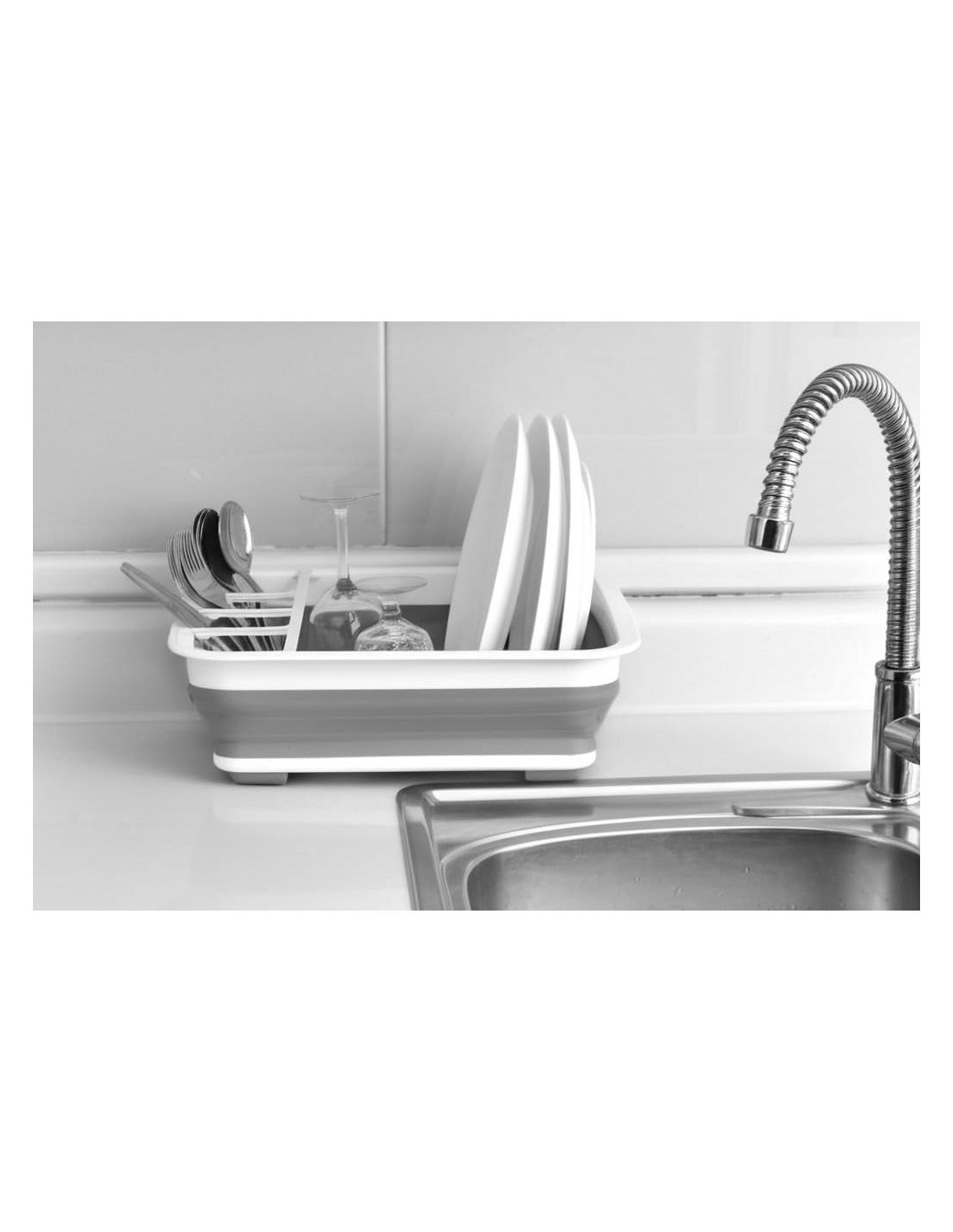 - Para una máxima eficiencia de drenaje, coloque un paño de cocina, trapo o toalla de cocina debajo del estante de platos cuando esté posicionado en la encimera para absorber la humedad. El estante cuenta con opciones de bandeja plegables y ajustables para acomodar tanto vajilla grande como pequeña mientras las mantiene secas y seguras. Con componentes recubiertos de silicona, a prueba de óxido, garantiza cualidades resistentes a las manchas, a los arañazos y a las llamas.
