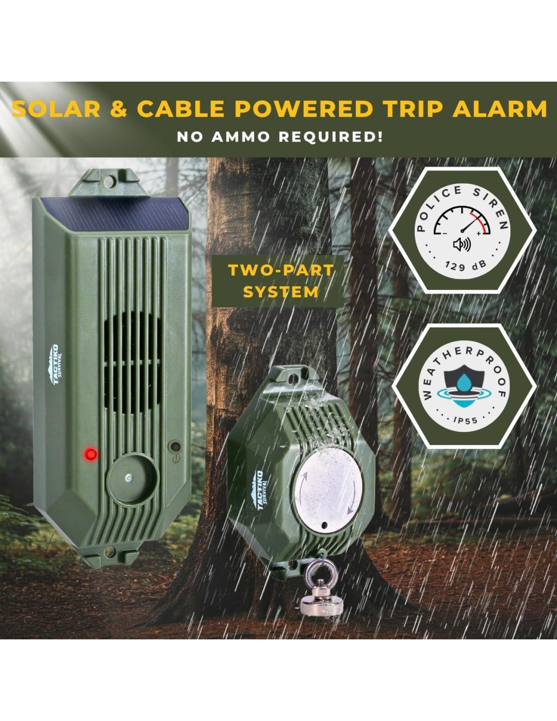 - Sin Munición Requerida: Más seguro y más simple que las alarmas de tripwire tradicionales; TACTIKO es recargable a través de solar o USB; no se necesitan cartuchos; conforme para uso diario