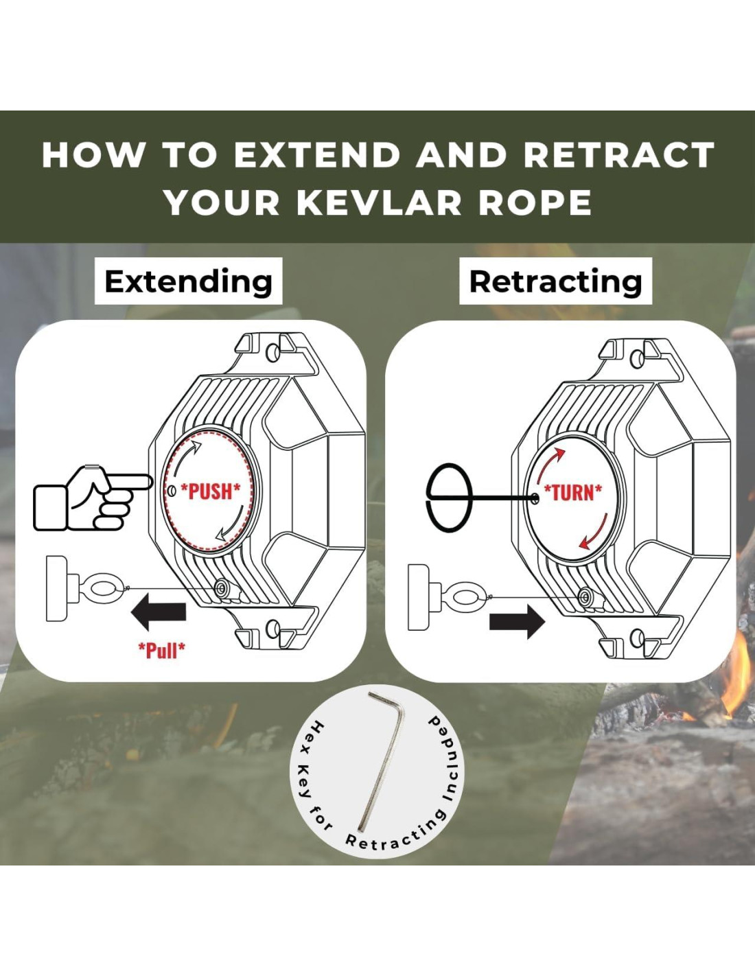 - Cable de Kevlar de 24.38 m (80 Ft) + Tensionador Magnético: Línea duradera de baja visibilidad con imán de rápida sujeción; establece un perímetro en menos de 60 segundos alrededor de tiendas, puertas o senderos