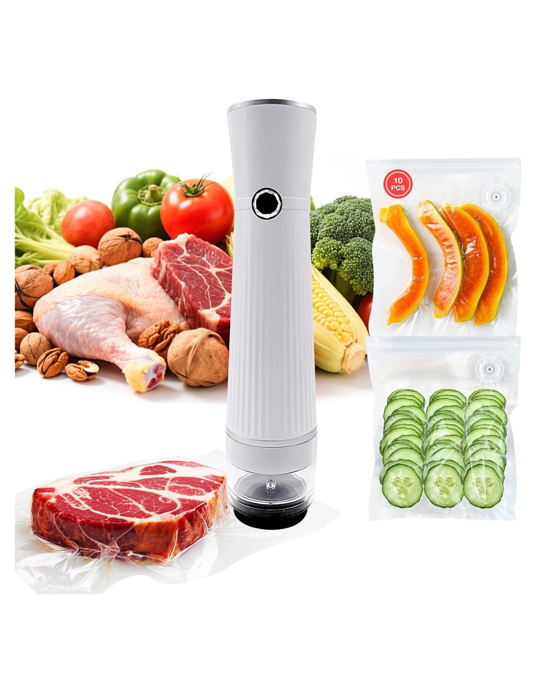 - 5X Frescura Extendida y Protección Alimentaria Versátil El sellador al vacío retiene el sabor y los nutrientes con poder de succión, manteniendo carnes, pescados, verduras y sobras frescas hasta 5 veces más que los métodos tradicionales. Su boquilla universal funciona sin problemas con bolsas de vacío sous vide, recipientes herméticos, ideal para productos secos, líquidos y alimentos delicados como pan o bayas.