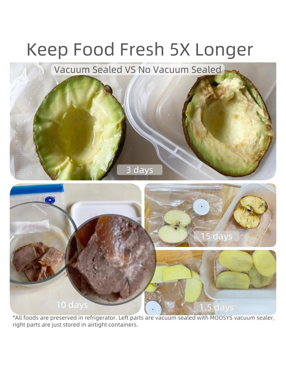 - 5X Más Fresco: Al crear un sellado al vacío hermético, el sellador de vacío MOOSYS puede extender la frescura de tu comida 5X más tiempo en comparación con métodos de preservación no al vacío. Es versátil para una amplia gama de alimentos, incluyendo verduras, frutas, champiñones, carnes, mariscos, productos secos, nueces, alimentos cocinados, sobras y más. Al usar nuestro sellador de vacío, reducirás el desperdicio de alimentos y disfrutarás de los beneficios de ahorrar tiempo, espacio y dinero.