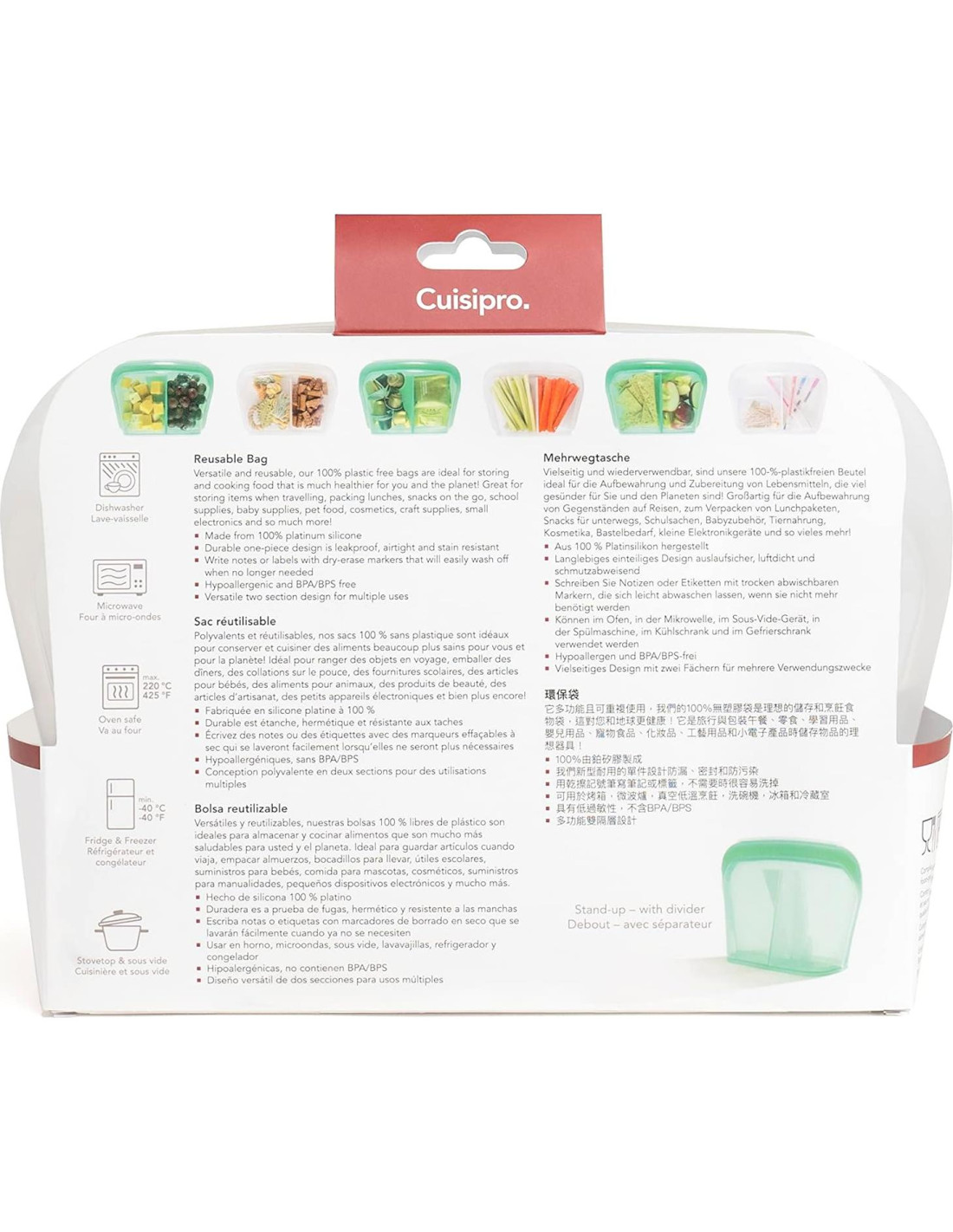 Las posibilidades son infinitas con las Bolsas Reutilizables Cuisipro. Resistentes al calor, resistentes al congelador, aptas para lavavajillas, hipoalergénicas, de grado alimenticio, libres de BPA/BPS y amigables para viajar, estas bolsas pueden empacar, almacenar, congelar, cocinar, proteger y organizar. El nombre Cuisipro se ha construido sobre una impresionante lista de "primeros" - nuevas ideas, innovaciones ingeniosas y soluciones inteligentes - que nos han convertido en los favoritos de los chefs gourmet en todo el mundo. Todo, desde pinzas de bloqueo, pantallas contra salpicaduras con patas, la máquina de helados Donvier, hasta tazas y cucharas medidoras en forma ovalada, las herramientas Cuisipro han sido creadas para realizar cada tarea específica con precisión y facilidad, siempre proporcionando los mejores resultados. Cuisipro: Diseño. Calidad. Innovación.