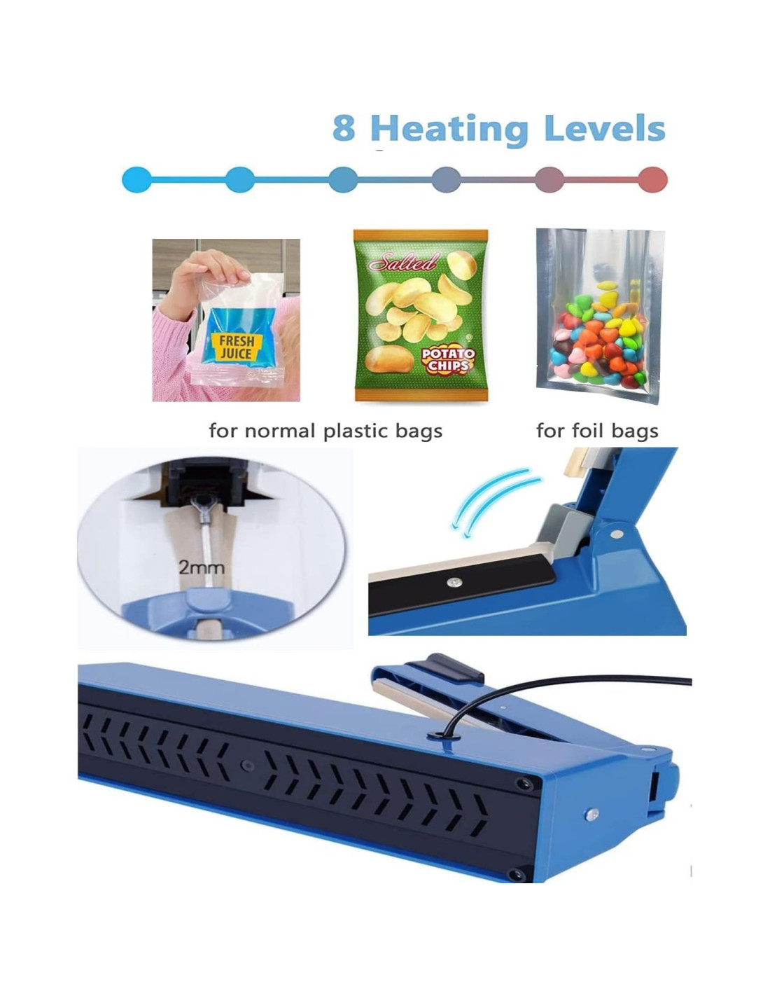 - Diseño de Apagado Automático - El elemento calefactor en el sellador de impulso no continuará calentándose. Una vez que se presiona la manija hacia abajo, la máquina calentará rápidamente los materiales y formará un sello. La luz se encenderá cuando la máquina de sellado esté en funcionamiento y se apagará después de que se complete el sellado.