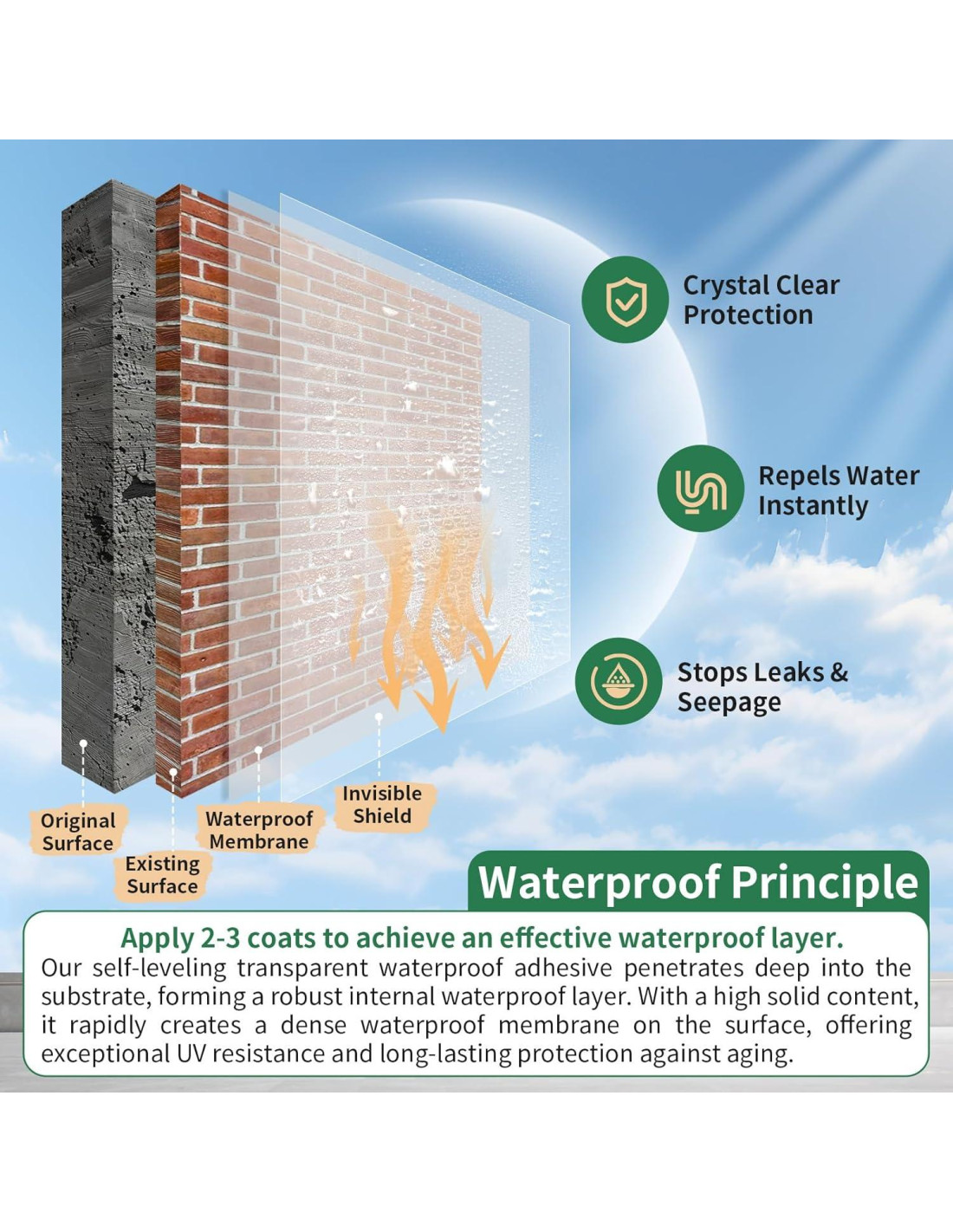 - [Solución Multi-Superficie para Interior y Exterior] - El revestimiento transparente YKF funciona en concreto, madera, ladrillo, metal y cerámica. Perfecto para techos, paredes, baños, tuberías y alféizares de ventanas. El agente transparente mantiene la textura de la superficie mientras proporciona protección confiable en todas partes.