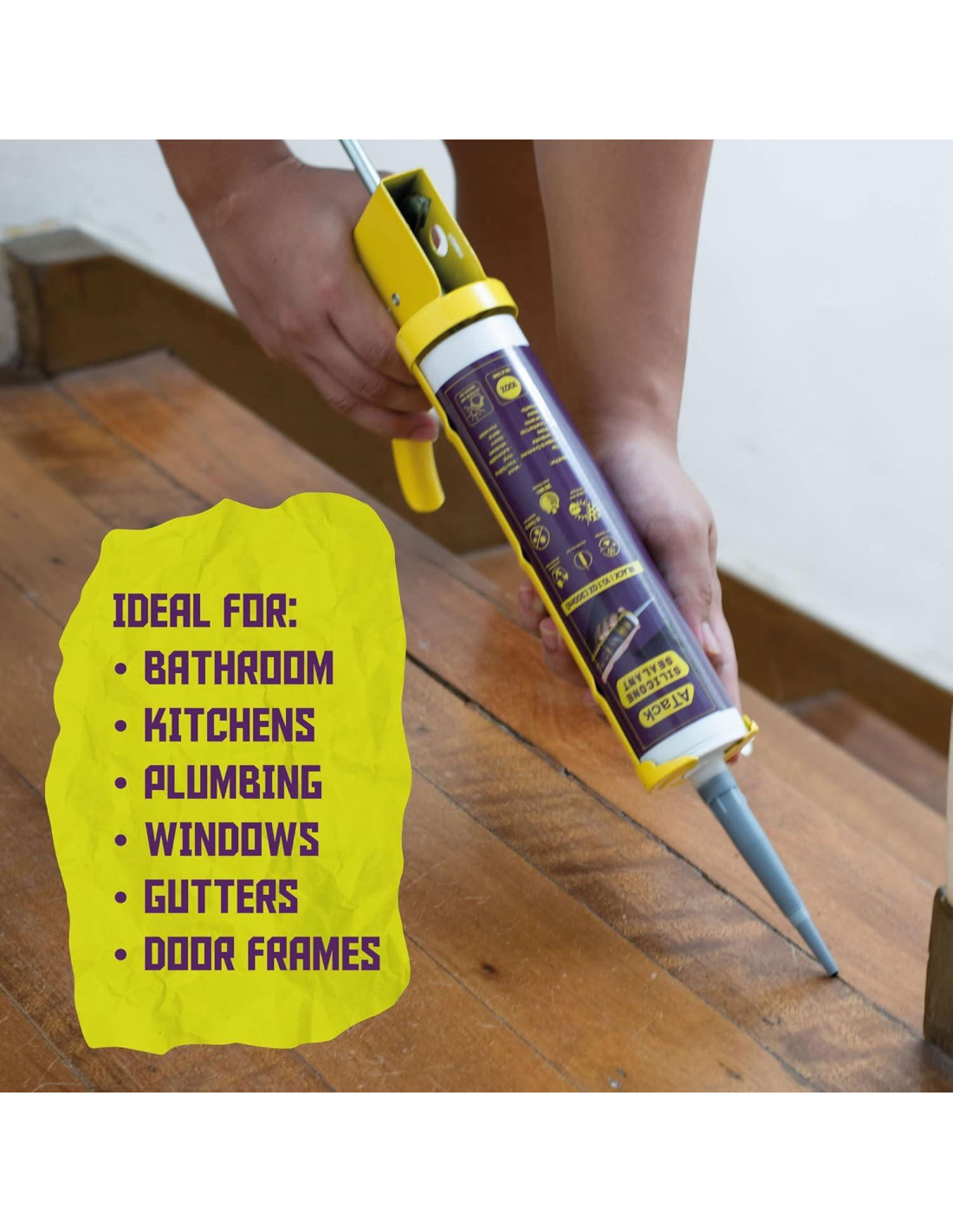- SIN TEXTURA GRUMOSA. Con una boquilla termoplástica sin obstrucciones, nuestro calafateo negro impermeable fluye con la viscosidad justa: ni líquido ni grumoso. Este sellador de ventana es 100% Silicona sin rellenos.