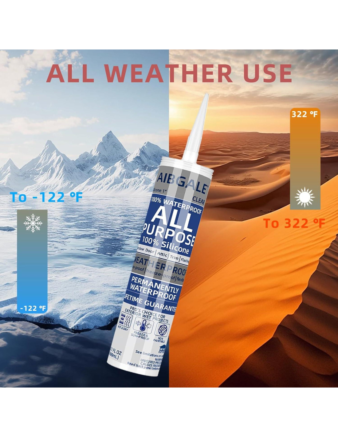 - Sin Encogimiento ni Grietas: El sellador de silicona transparente presenta una excelente adhesión y mantiene una flexibilidad duradera, no se encogerá ni agrietará incluso cuando esté expuesto constantemente a condiciones climáticas extremas, incluyendo frío, calor, UV o gotas de lluvia constantes
