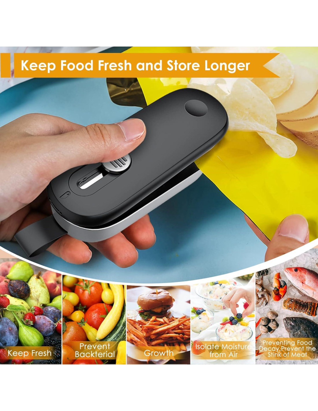 - Mantén la Comida Fresca: Puedes re-sellar las bolsas originales con este sello de bolsas para papas, manteniendo los alimentos y snacks más frescos, aislando el aire y reduciendo el desperdicio. ¡Tu buen ayudante para una familia más saludable!