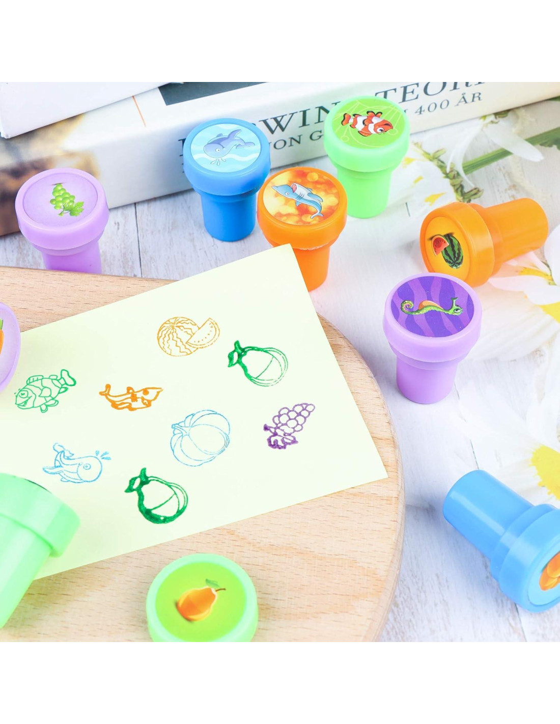 - Material Premium: Cada sello está hecho de plástico PP de alta calidad y una almohadilla de tinta segura. No tiene olor peculiar y es muy adecuado para niños