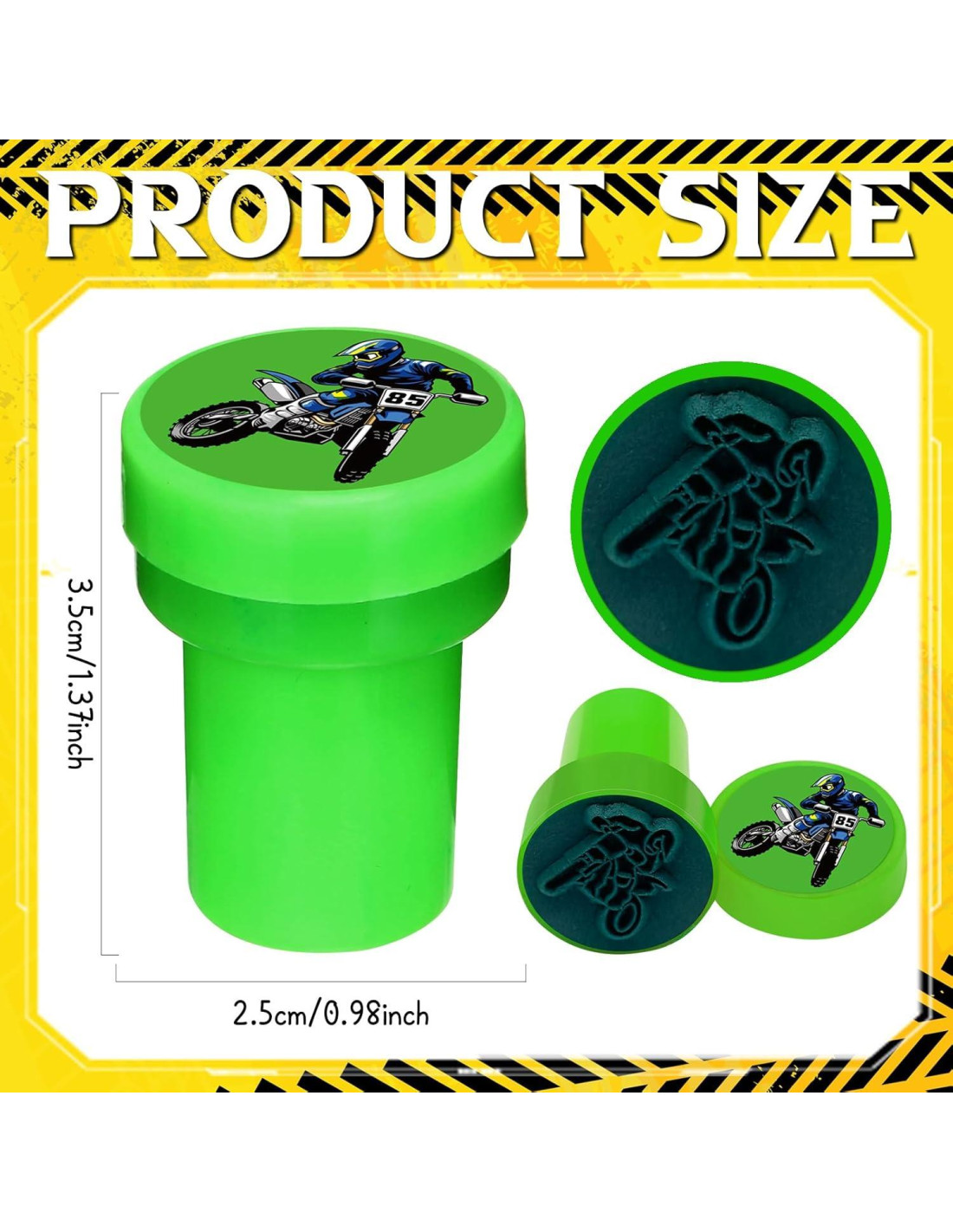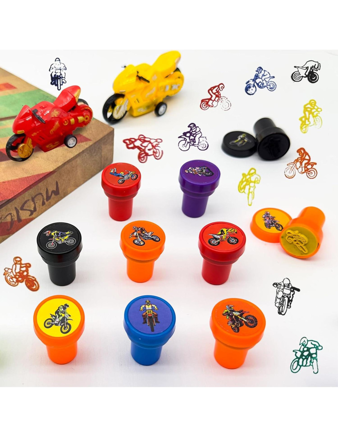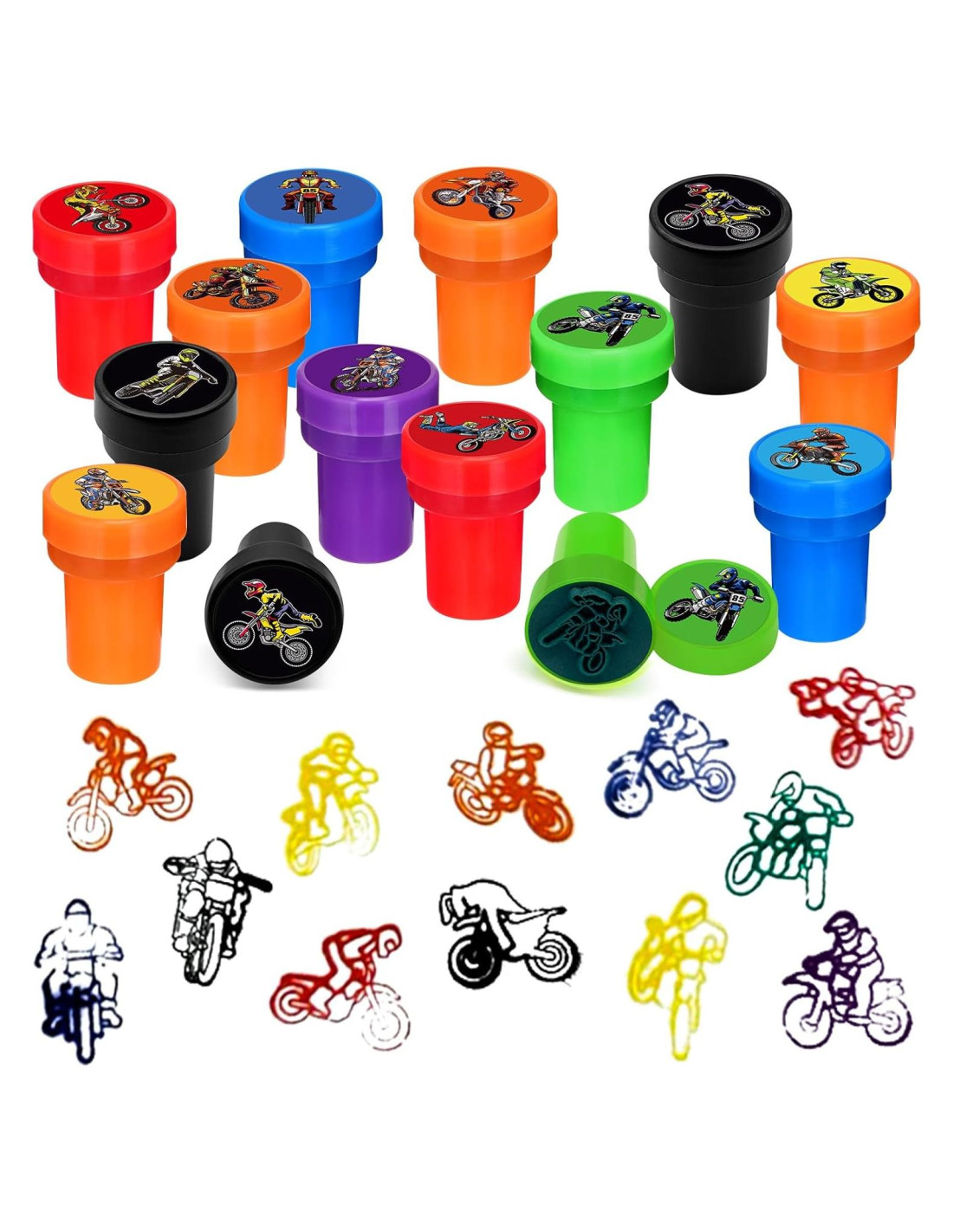 - Conjunto Completo de Motocross: Viene con 24 sellos de motocicleta de tierra en 12 diseños y colores audaces. Cada sello mide 1.5 pulgadas (3,81 cm) de alto y 1 pulgada (2,54 cm) de ancho, fácil de sostener, divertido de usar y listo para correr hacia la creatividad.