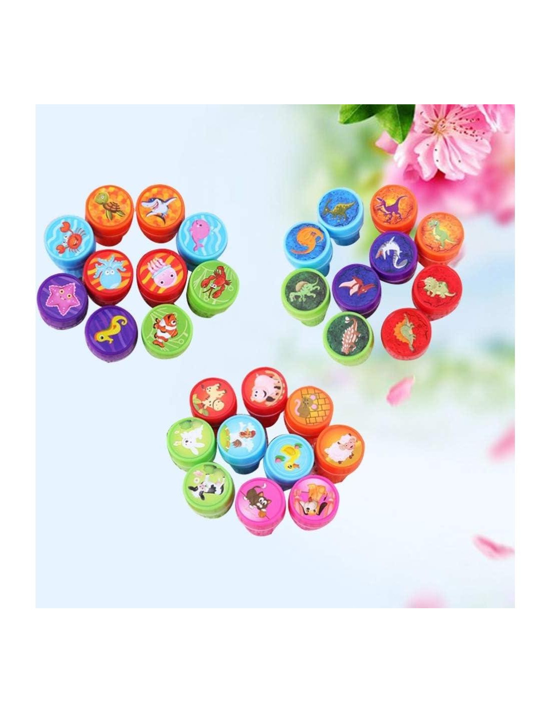 - Los sellos vienen en varios colores y diseños que incluyen dinosaurio, cangrejo, pez, ballena, tortuga, caballito de mar, tiburón, pulpo, etc. 3 Conjuntos en total, uno es el mundo de los dinosaurios, uno es animales de granja, y el mundo.