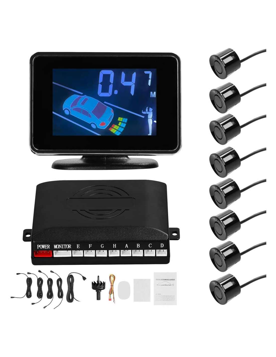 - Fácil de Ver: Pantalla digital LCD de alta calidad muestra la distancia y dirección del obstáculo en tiempo real a través de una matriz de colores rojo/amarillo/azul, que es clara de un vistazo y conveniente para que los conductores evalúen la situación.