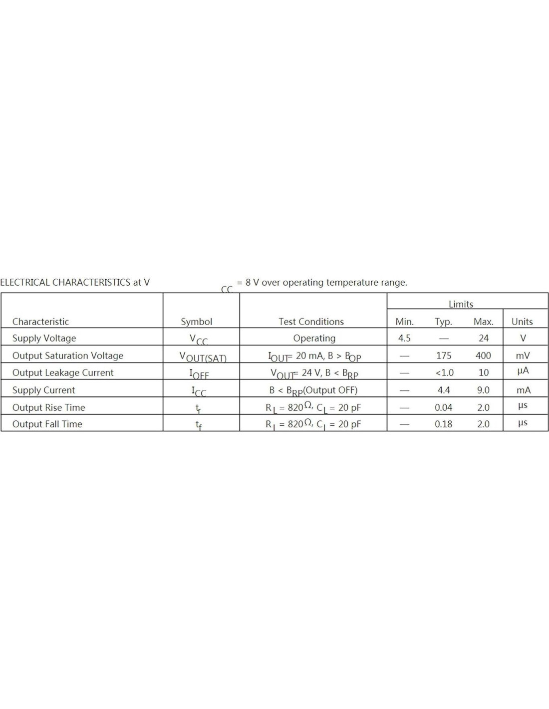 Voltaje de Suministro: 28 V Voltaje de Batería Inversa: -35 V Densidad de Flujo Magnético: Ilimitada Voltaje de Salida APAGADO: 28 V Voltaje de Salida Inversa: -0.5 V Corriente de Salida Continua: 25 mA Rango de Temperatura de Almacenamiento: -65C a +170C Paquete incluye: 10pcs*A3144