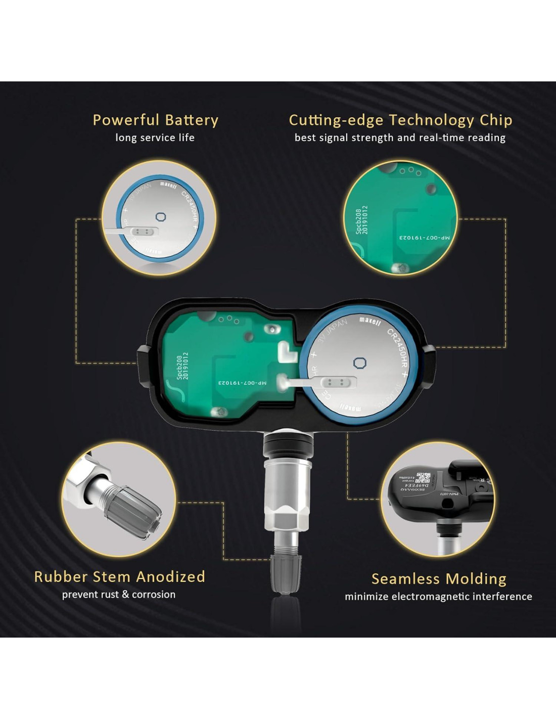 - ALTA CALIDAD: Los sensores de presión de neumáticos Marsflex incluyen una batería mejorada que mejora el rango de temperatura de operación de -40C a +125C, y tiene una vida útil de 5-8 años. El chip de tecnología de vanguardia proporciona la mejor fuerza de señal, leyendo en tiempo real la condición de sus neumáticos.
