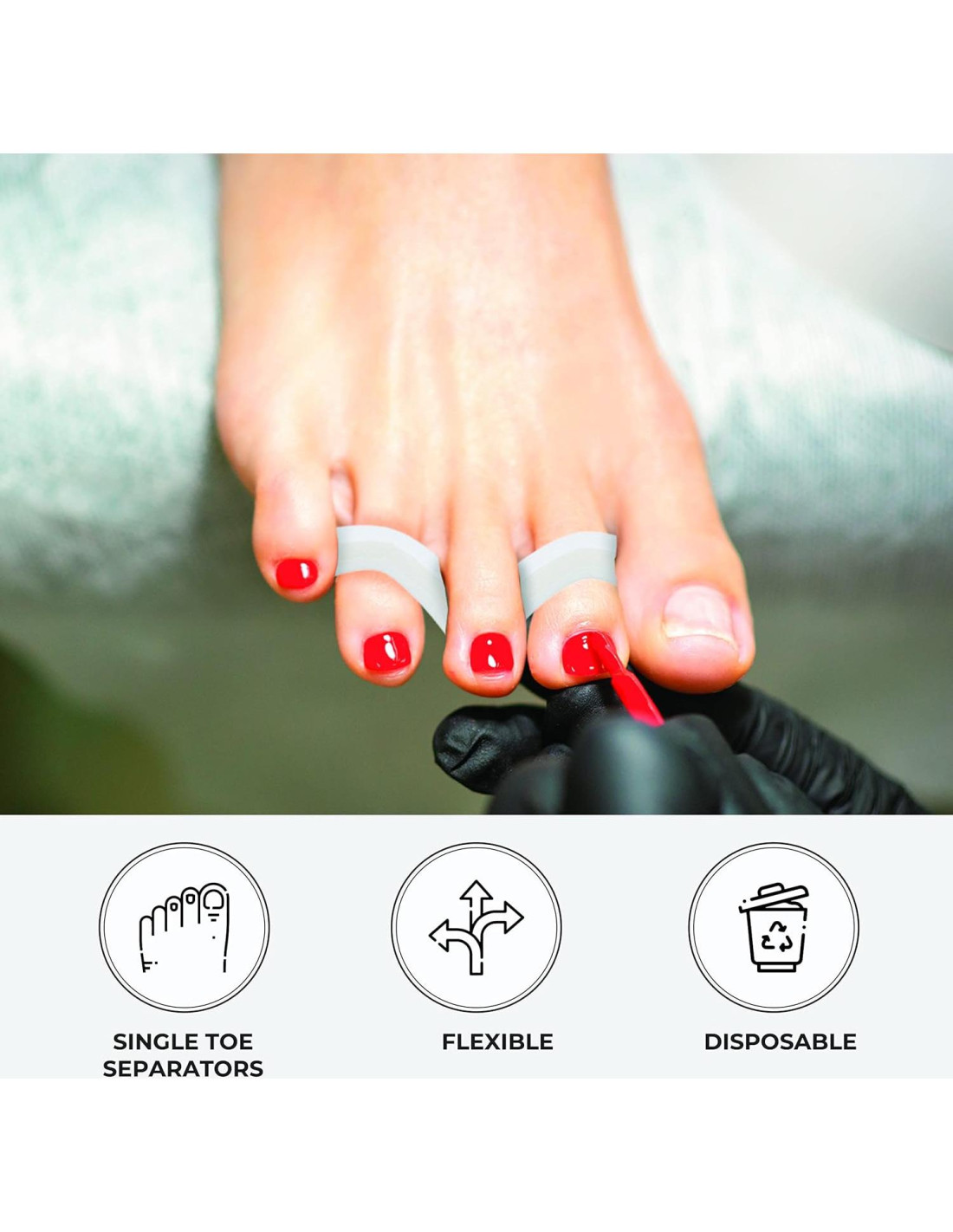 - Cómodos de Usar: Puedes usar 1 tira separadora de dedos por pie para asegurar la máxima comodidad. Se entrelaza fácilmente entre los dedos para mantener la piel libre de gérmenes, esmalte de uñas y otros desechos.