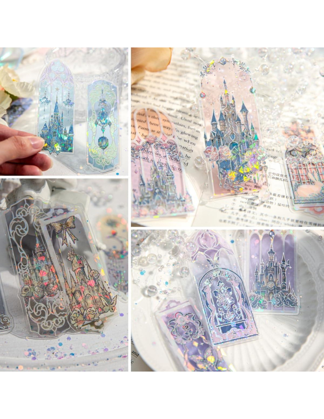 - DISEÑO REFLECTANTE Y HOLOGRÁFICO - Hechos de material plástico de alta calidad (PVC), estos pequeños marcadores transparentes vienen con contornos holográficos plateados y acentos iridiscentes de cristal de hielo, brillan y cambian de color cuando los miras desde diferentes ángulos y luces, ¡haciéndolos lucir encantadores y delicados! También tienen una ligera textura en relieve, lo que hace que no se deslicen fácilmente de tu libro.