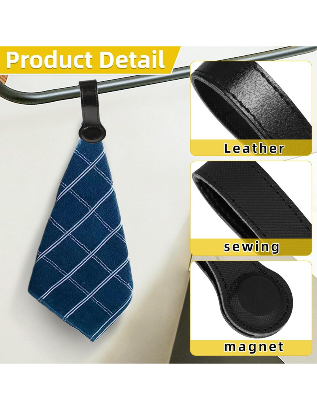 - Versátil: Un conjunto de 3 clips de toalla de cuero magnéticos para colgar fácilmente toallas de mano de puerta de horno, toallas de platos, toallas de baño y toallas de té. También se puede usar para almacenar sombreros, delantales, toallas de playa, etc.