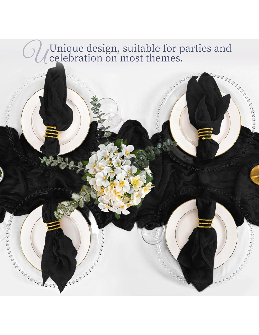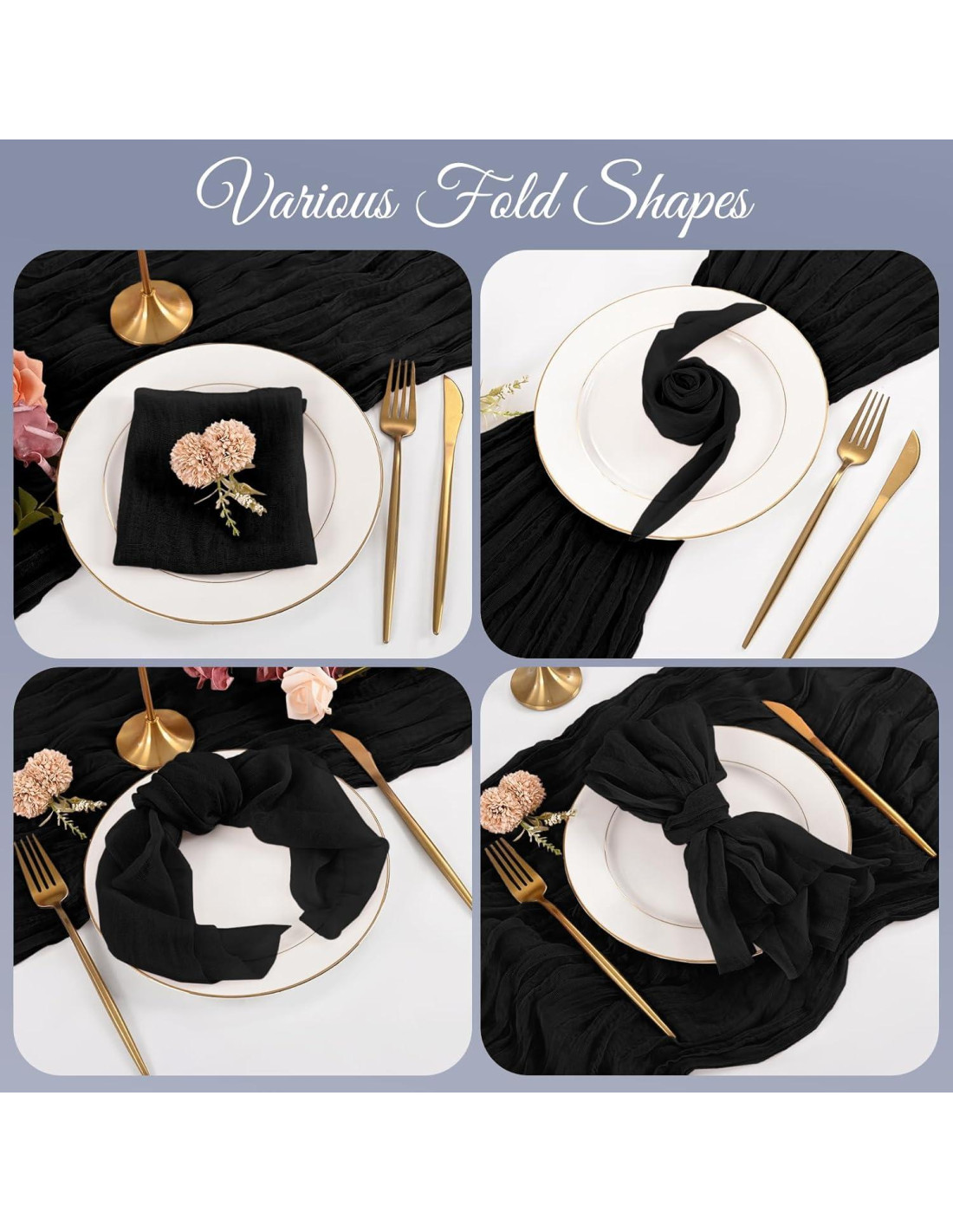 - [Conjunto de Servilletas de Gasa] Recibirás un conjunto de 100 servilletas de tela negras, cada una mide aproximadamente 20 x 20 pulgadas (50 x 50 cm) cuando se estira. Servilletas de tela a granel, cantidad suficiente para tu boda, fiesta, baby shower, banquetes, decoraciones de mesa para reuniones familiares. Las servilletas de gasa negras tienen una textura arrugada natural, hacen que tus eventos sean más románticos y elegantes.