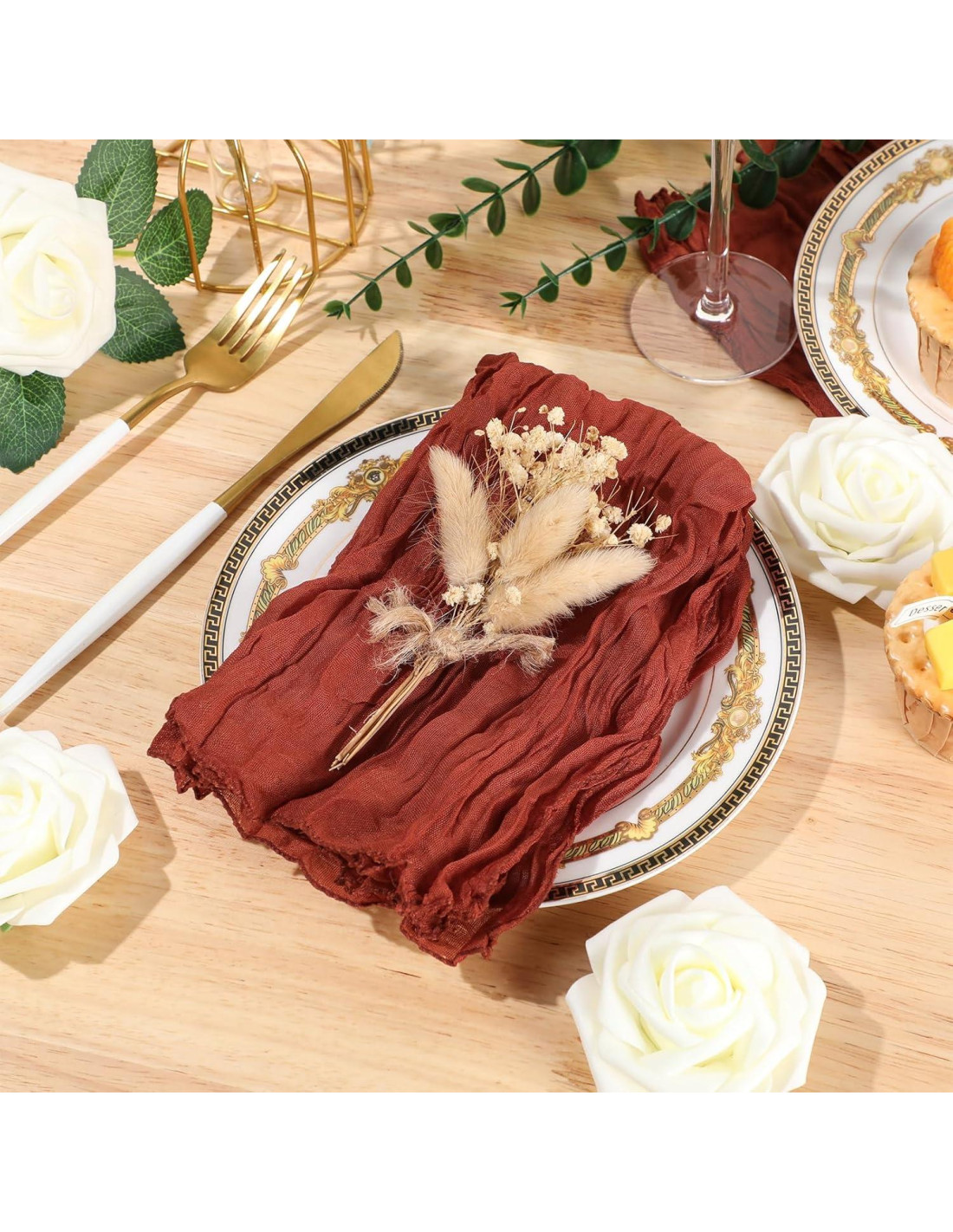 - Material de calidad: estas servilletas terracota están hechas de material de gasa de calidad, suaves, ligeras y transpirables, la apariencia arrugada las hace lucir elegantes y delicadas, creando una atmósfera agradable y romántica, adecuadas para diversas ocasiones importantes y estaciones