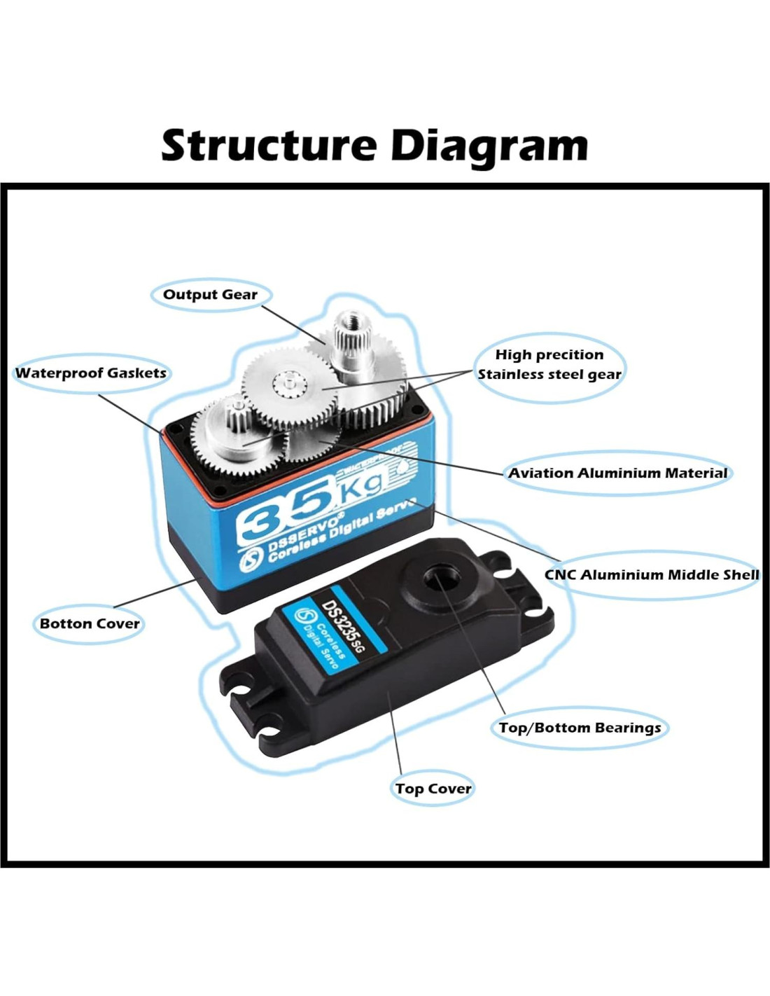 Wishiot 35KG Motor Servo Digital Sin Núcleo de Alto Par Impermeable con Engranaje de Metal Completo para 1/8 1/10 1/12 Ventajas de los motores sin núcleo: Motor con núcleo de hierro (núcleo): con núcleo de hierro, respuesta lenta Motor sin núcleo (sin núcleo): sin núcleo, solenoide, respuesta rápida Aplicar Condición Ambiental Rango de Temperatura de Almacenamiento: -30C a 80C Rango de Temperatura de Funcionamiento: -15C a 70C Rango de Voltaje de Funcionamiento: 5-8.4V Especificación Mecánica Tamaño: 40*20*38.5mm Peso: 60g Relación de engranaje: 342 Rodamiento: Doble rodamiento Cable de conector: 300+/-15mm Motor: Motor sin núcleo Rendimiento impermeable: IP66 Especificación Eléctrica Voltaje de Funcionamiento: 5V 7.4V 8.4V Corriente en reposo (detenido): 5mA@5V -- [email protected] -- [email protected] Velocidad de funcionamiento (sin carga): 0.18 seg/60@5V -- 0.13 seg/[email protected] -- 0.11seg/[email protected] Par de bloqueo (bloqueado): 23 kg-cm@5V -- 30 [email protected] -- 35 [email protected] Corriente de bloqueo (bloqueado): 2.2A@5V -- 2.9 [email protected] -- [email protected] Especificación de Control Sistema de Control: PWM (Modificación de ancho de pulso) Rango de ancho de pulso: 500-2500seg Posición neutra: 1500seg Grado de funcionamiento: 180 o 270 (cuando 500-2500 seg) Ancho de banda muerto: 2 seg Frecuencia de funcionamiento: 50-330Hz Dirección de rotación: En sentido antihorario (cuando 500-2500 seg) NOTA: Este timón es impermeable hasta IP66. Todos los servos IP66 son a prueba de salpicaduras y no se pueden usar bajo el agua. Para uso a bordo, se puede reforzar con un caucho impermeable/caja impermeable para prolongar su vida útil.