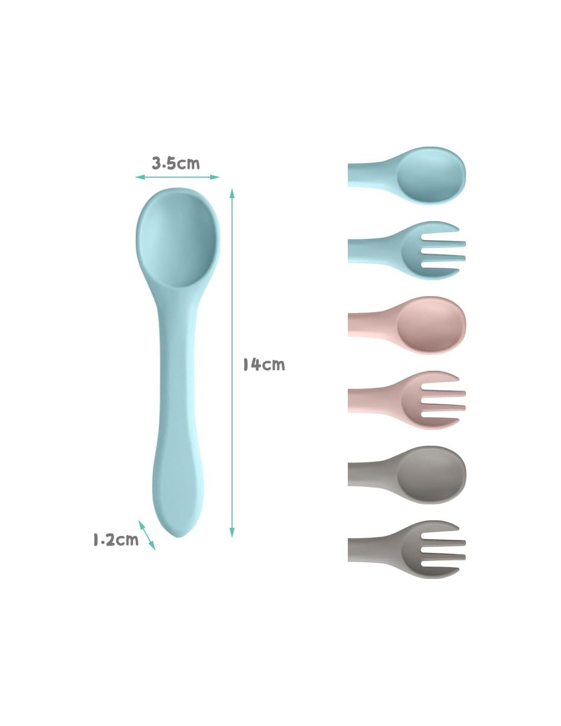 - Diseñado para bebés. Las cucharas y tenedores de silicona están diseñados ergonómicamente, y el tamaño de una cuchara o tenedor individual es 14 x 3.5 cm. La superficie de la cuchara es suave y cómoda, adecuada para las manos suaves y frágiles del bebé, sin tallados y patrones engorrosos que rocen contra las pequeñas manos. Las cucharas son lo suficientemente duraderas para soportar a un bebé que está en la etapa de dentición, pero lo suficientemente ligeras para que las pequeñas manos las sostengan.