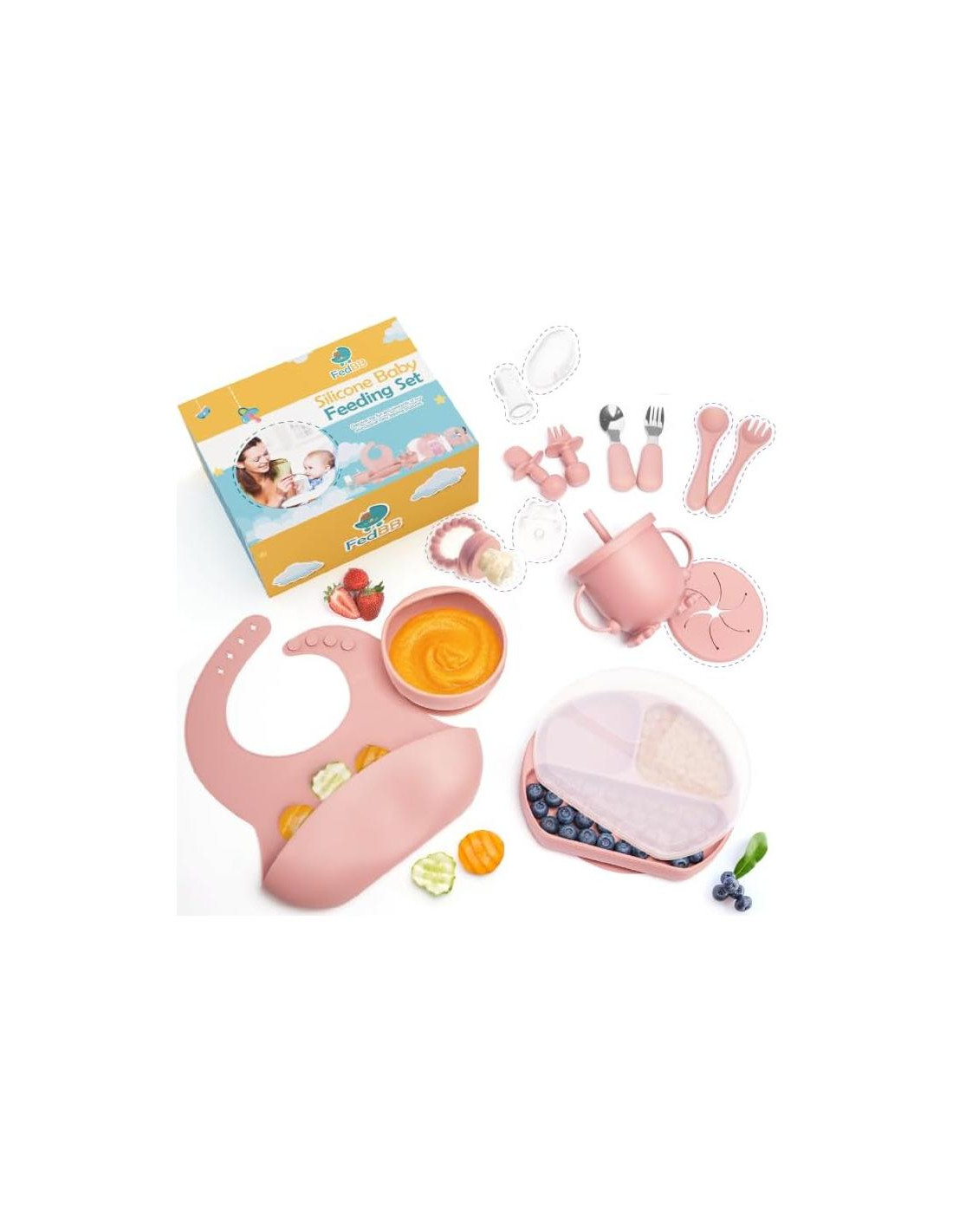 - JUEGO COMPLETO DE ALIMENTACIÓN PARA BEBÉS: Descubre la diversión y simplicidad de nuestros productos de alimentación para bebés. Este juego de 17 piezas contiene 1 plato de succión para bebés con tapa, 1 tazón de succión, 1 tenedor de silicona, 1 cuchara de silicona, 1 vaso de silicona con tapa y popote, 1 babero ajustable, 1 juego de tenedor y cuchara para la primera etapa, 1 cuchara de acero y tenedor de acero, 1 alimentador de frutas y 1 cepillo de dedo y estuche.