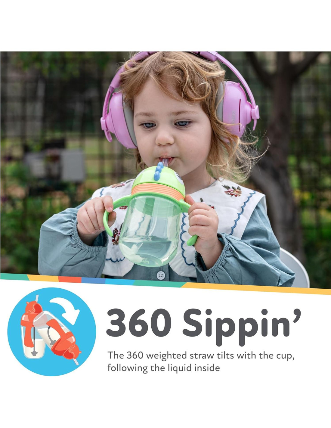 - Taza para niños sin derrames: La pajita de silicona es una pajita con peso de 360 grados que se mueve hacia el líquido donde sea que se incline la taza, permitiendo que tu hijo beba hasta la última gota; La tapa Flip-It es perfecta para llevar