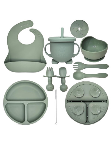 - SET COMPLETO DE ALIMENTACIÓN DE SILICONA PARA BEBÉS: Nuestro set de alimentación para el destete de bebés incluye todo lo necesario para ayudar a tu pequeño a hacer la transición a comer de forma independiente. Los suministros de alimentación para bebés incluyen 1 plato con ventosas y divisores, 1 tazón con ventosas, 1 babero ajustable con recolector de comida, 1 taza con sorbete y tapa, 1 tapa para taza de bocadillos, 1 cuchara, 1 tenedor, 1 cuchara para bebé, 1 tenedor para bebé y 1 palo de limpieza. Los suministros de alimentación para bebés son fáciles de agarrar y comer para las pequeñas manos de tu bebé, manteniendo la hora de comer agradable y menos desordenada!