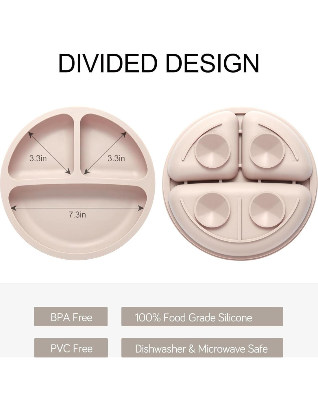 - Platos Divididos para Niños con Succión: Nuestros platos para bebés cuentan con diferentes compartimentos divididos para que los padres puedan servir diferentes sabores de comida. Los bordes elevados de los platos facilitan que el bebé recoja la comida con una cuchara, y el diseño antideslizante en la parte inferior asegura que el plato no se arroje al suelo, reduciendo así los desordenes.