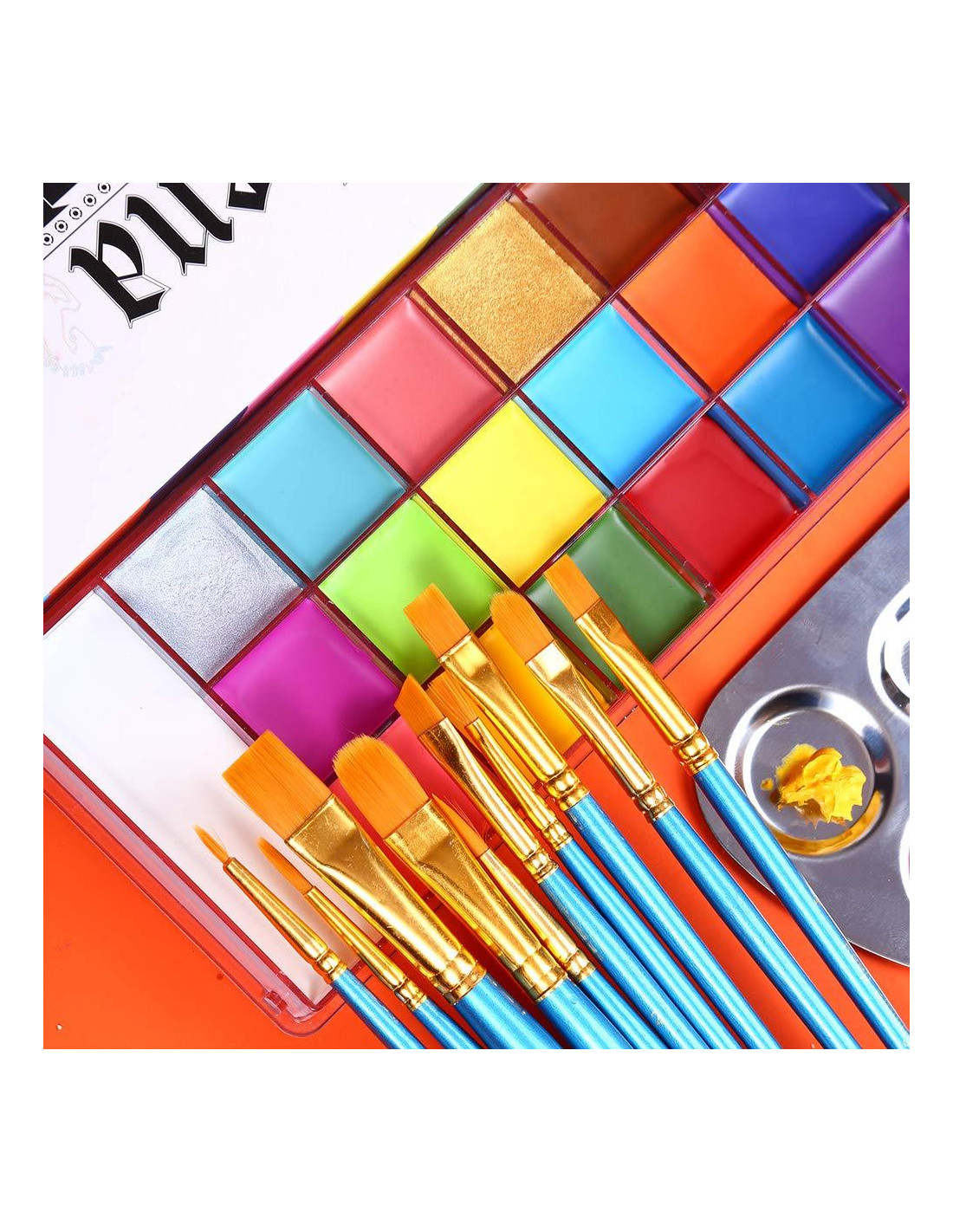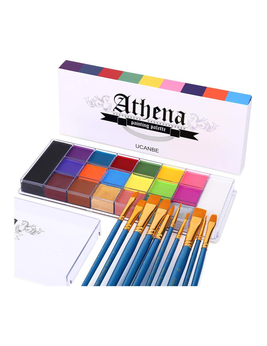 - Athena 20 Colores de Pintura + 10 pcs Pinceles Profesionales. Con estos pinceles puedes pintar lo que desees. Funciona excepcionalmente bien para todos los aspectos de la pintura facial y corporal, como trabajo de líneas, trabajo base, difuminado y capas.