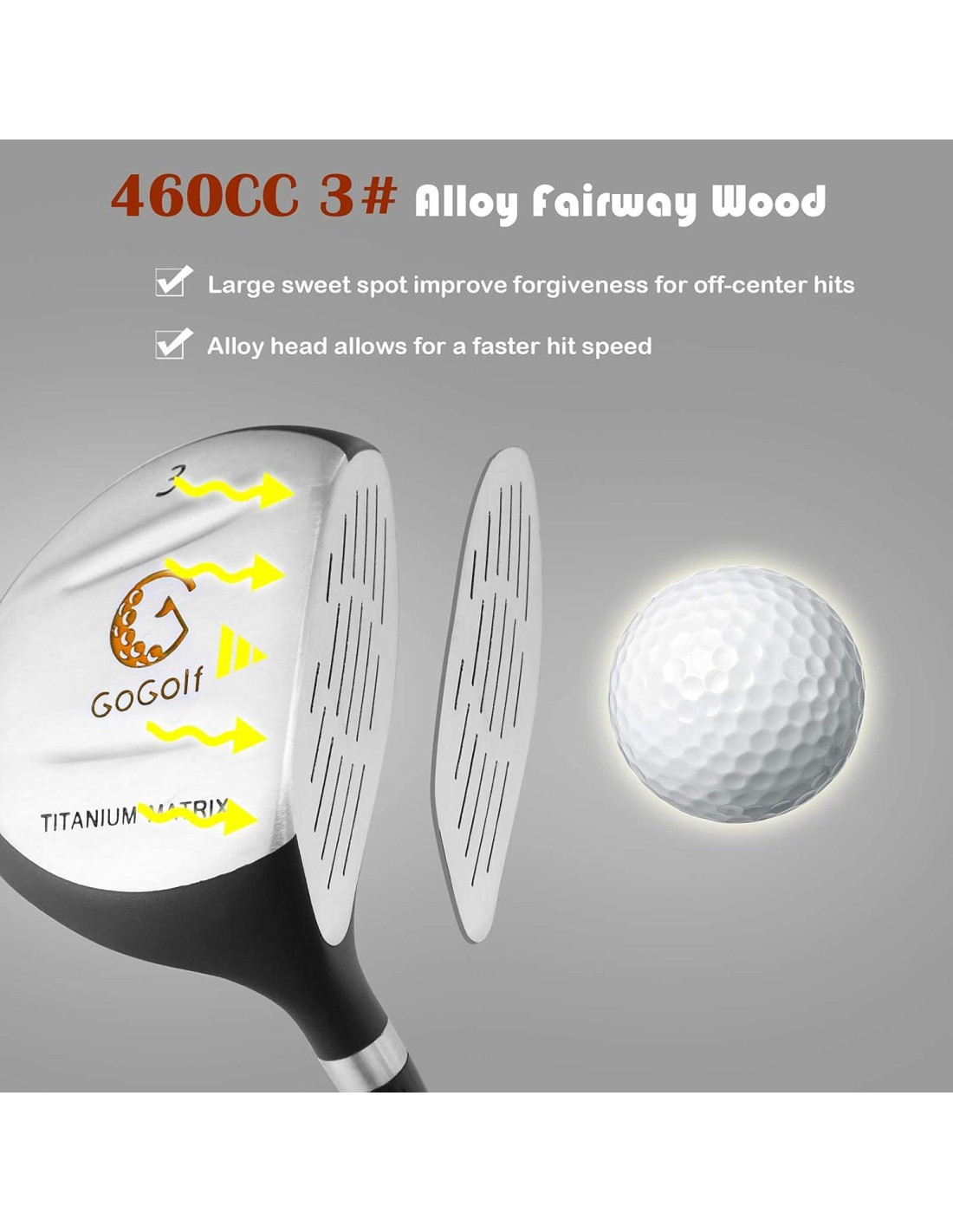 - [Madera de Fairway de Aleación 460CC] : La madera de fairway 3# de este set completo de palos de golf junior está ponderada en el talón y la punta, ofreciendo el centro de gravedad óptimo y un lanzamiento más alto. Mientras tanto, este set de palos de golf viene con un eje más largo y suave, permitiendo a los niños golpear la pelota más rápido y lograr tiros más altos y lejanos.