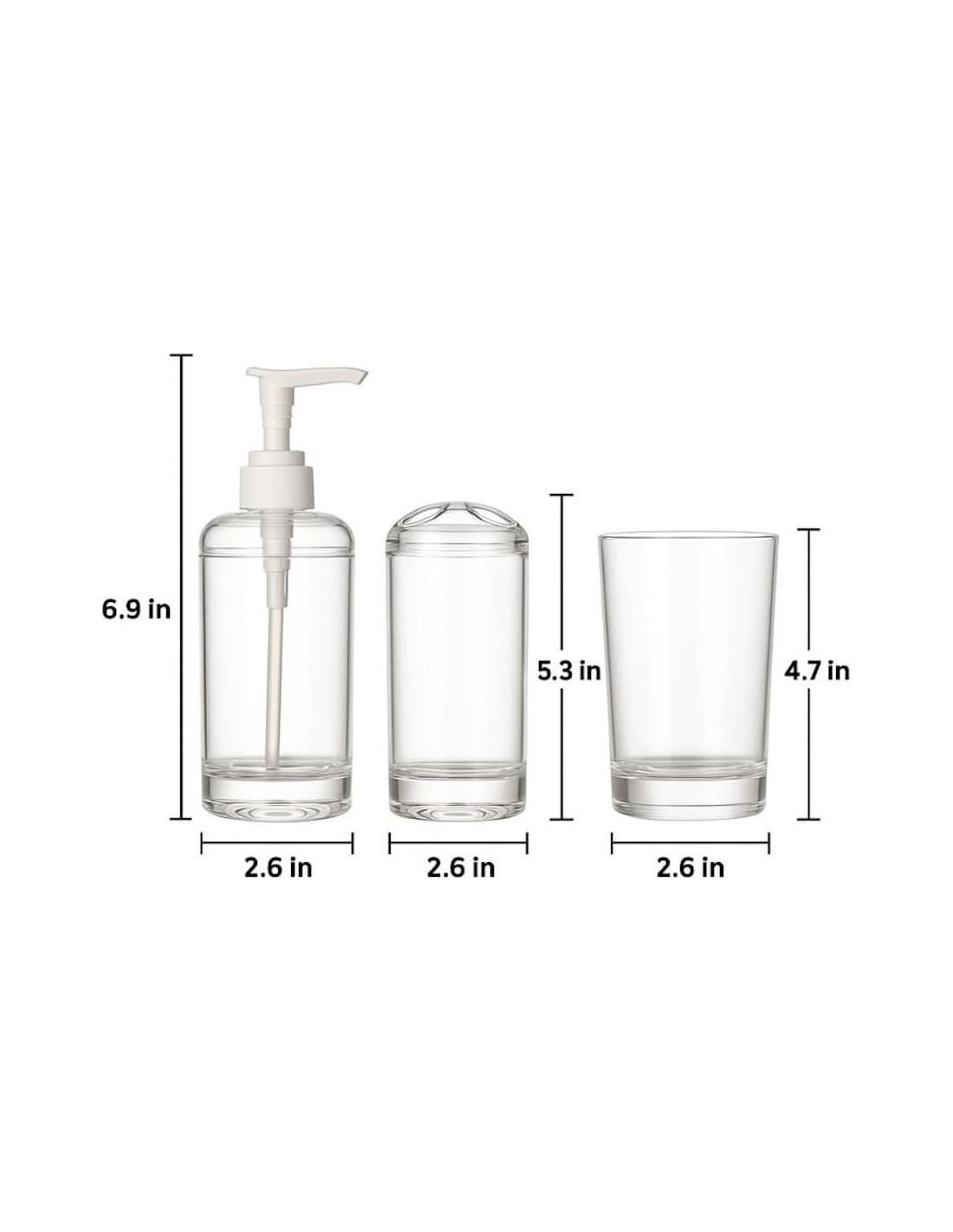 - Fácil de Mantener: El juego de accesorios de baño transparente presenta una superficie lisa y no porosa para una limpieza sin esfuerzo. Ligero pero duradero, el dispensador de jabón transparente, el soporte para cepillos de dientes transparente, y los vasos de baño de plástico resisten la humedad y aseguran un uso prolongado. Este juego de tocador de baño es perfecto para organizar necesidades del hogar o del baño - un soporte para q tip, un dispensador de qtip, un dispensador de jabón y loción para baño, un dispensador de enjuague bucal para baño, un soporte para cepillos de dientes y pasta de dientes, un soporte para jabón de baño, un dispensador de jabón de cocina, o un soporte para cepillo de dientes de vidrio falso. Diseñado para limpieza y conveniencia, este juego mantiene tu baño ordenado y elegante.