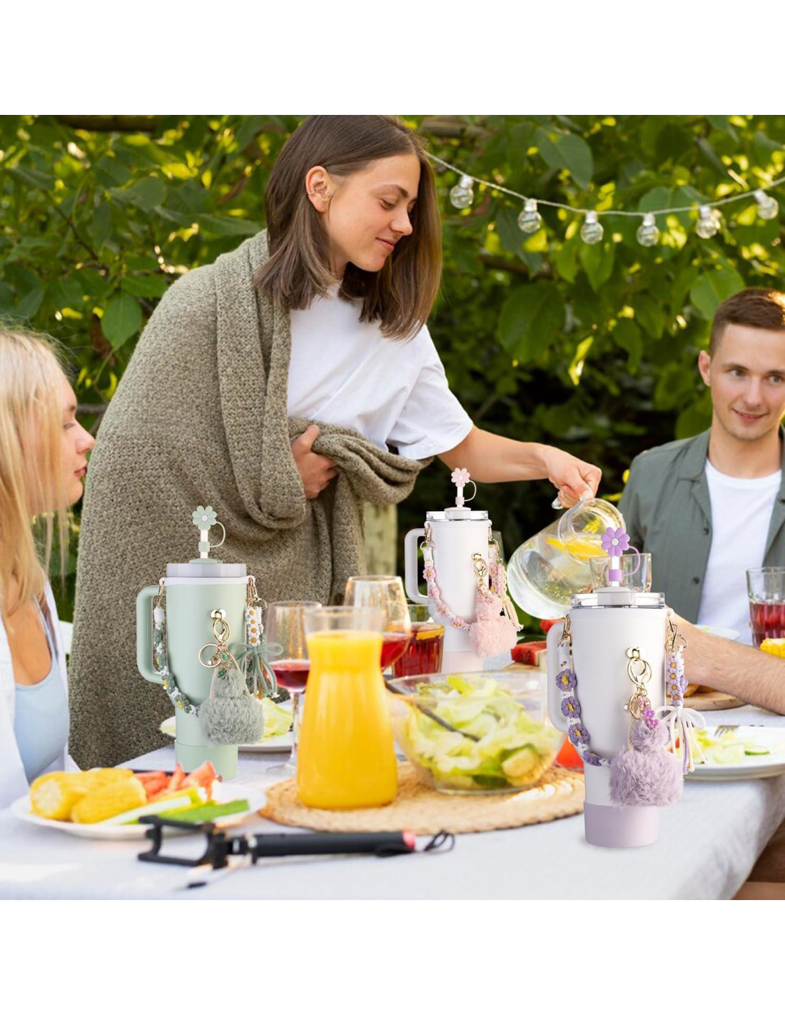 - ACCESORIOS DE MODA - Nuestras asas para botellas de agua están equipadas con anillos de seguridad de silicona, asas trenzadas bohemias y cordones, y los charms están equipados con bola de peluche, bolsa de peluche, gancho en forma de corazón y llaveros con flor, que no solo hacen que sea conveniente llevar tu Stanley cup, sino que también hacen que tu Stanley Cup sea más elegante