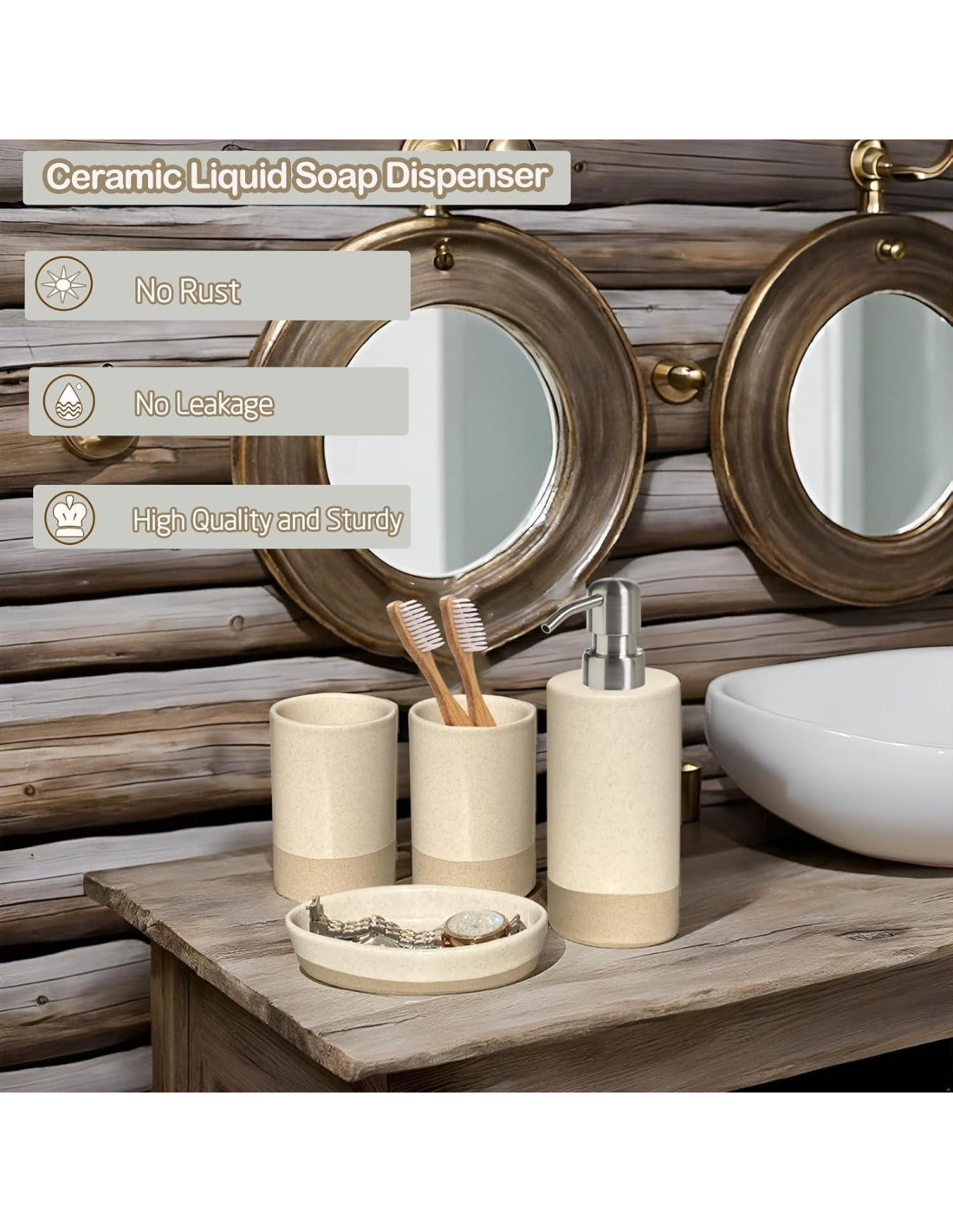- Versátil: Versátil en tu vida diaria, este Juego de Accesorios de Baño de Cerámica Beige es perfecto para dispensar lociones, aceites esenciales, champús, geles de baño y más, combinando conveniencia y practicidad.