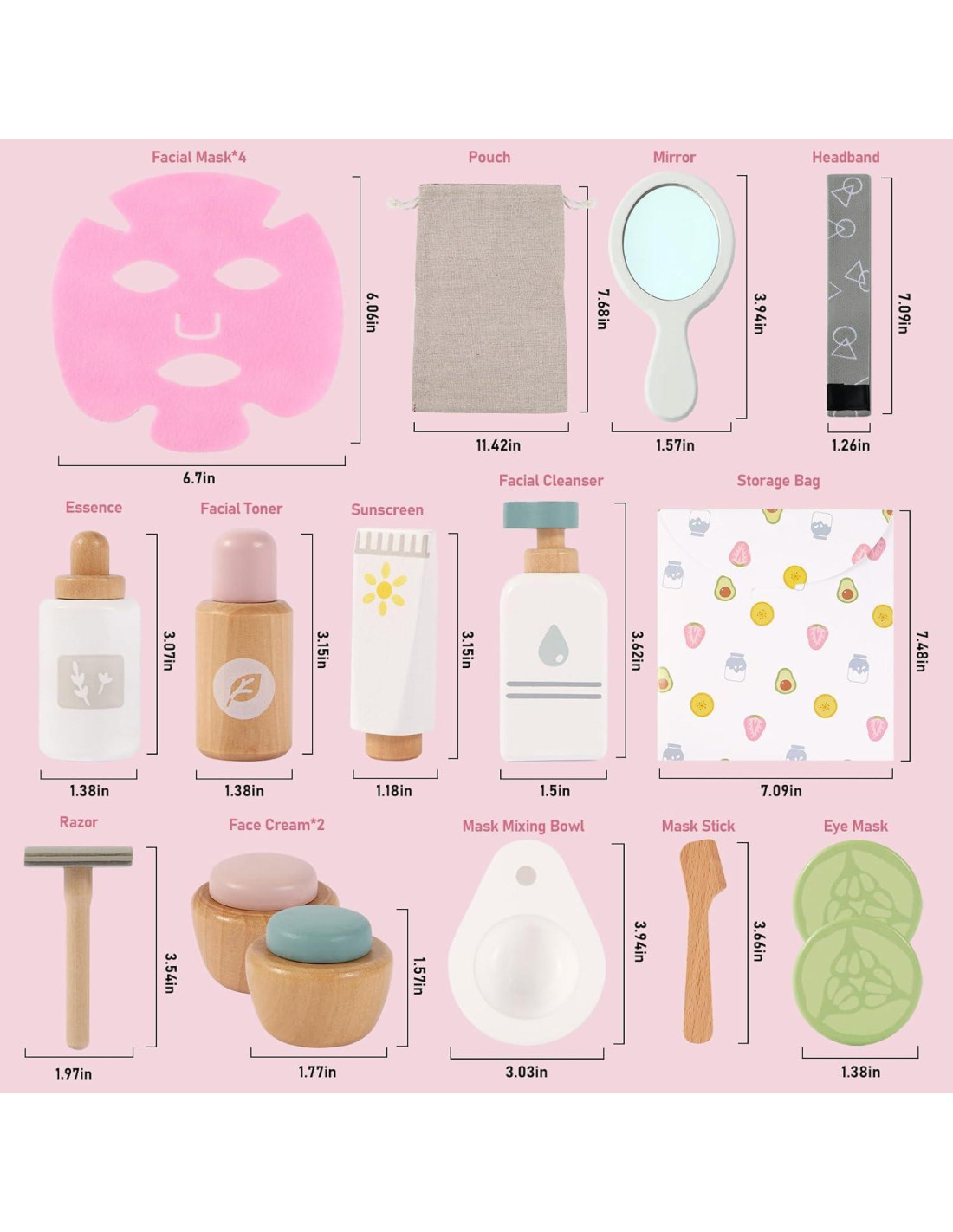 Nuestro kit de maquillaje de madera para niños contiene una variedad de accesorios de madera, incluyendo espejo, rasuradora, máscara para los ojos, 2* crema facial, protector solar, limpiador facial, limpiador facial, tónico, esencia, tazón para mezclar máscara facial, palo para máscara facial, banda para el cabello, 4* máscara facial, y también te proporcionaremos una bolsa de almacenamiento extra para guardar estos juguetes de madera, para que el almacenamiento de tus juguetes esté bien organizado. Este juego de juguetes de cuidado de la piel de madera está cuidadosamente hecho de madera de alta calidad, resistente y duradera, con un diseño de producto de cuidado de la piel interesante y realista, asegurando que cada juguete de guardería sea suave y sin astillas, colorido y más seguro de usar que el maquillaje real. Deja que los niños jueguen libremente en un entorno seguro y estimula su capacidad práctica, imaginación y creatividad. Nuestro kit de maquillaje de simulación para niñas no solo mejora la coordinación mano-ojo a través del juego de roles, sino que también permite a los niños aprender a compartir, cooperar y comunicarse entre sí en el juego de roles, mejorando su capacidad práctica, desarrollo social y emocional. Al mismo tiempo, los padres también pueden participar, crear momentos hermosos con sus hijos y mejorar la interacción entre padres e hijos. Es muy adecuado para usar en diversas escenas como juegos de roles, cumpleaños, actuaciones, reuniones familiares, Navidad, Halloween, etc., para compartir momentos felices con amigos.