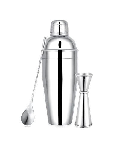 - Cada set de shaker de cóctel comprende un shaker de acero inoxidable de 24 fl. oz. (710 ml), una cuchara de cóctel de 8 pulgadas (20.32 cm) y un jigger de 1 oz/2 oz (30 ml/60 ml), todos fabricados en acero inoxidable 18/8, de grado alimenticio, anti-corrosivo y resistente a la oxidación. El acabado espejo añade un toque limpio y profesional, perfecto para los entusiastas de los cócteles en movimiento.