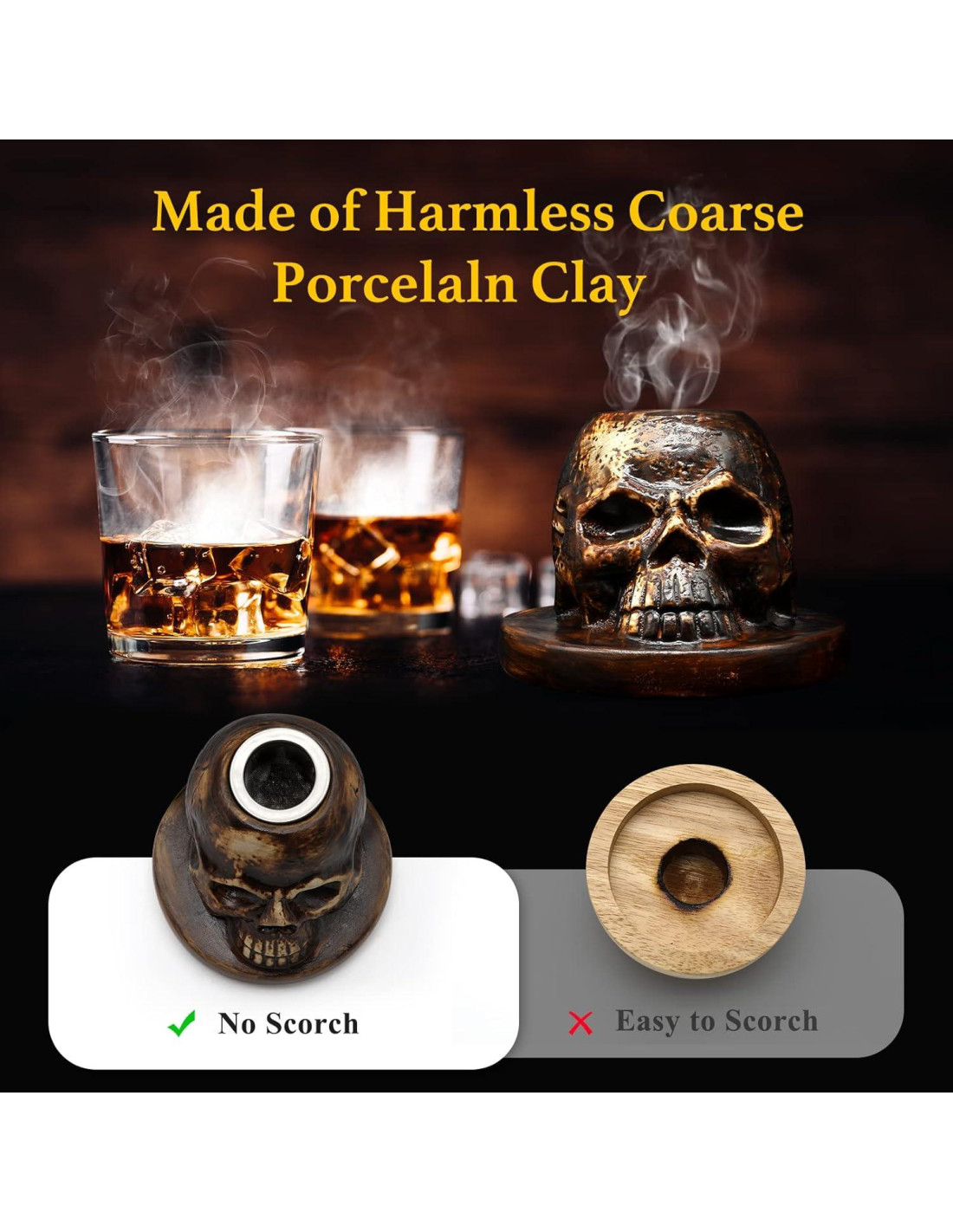 - [Fácil de usar] : 1. Coloca la chimenea de cerámica en forma de calavera sobre tu cóctel en una copa de vidrio. 2. Llénalo con las astillas de madera y quema la cámara de ahumado con el soplete de butano durante 10 - 20 segundos. 3. Déjalo reposar durante 30 - 60 segundos para permitir que el humo se infunda. 4. Disfruta de tu bebida.