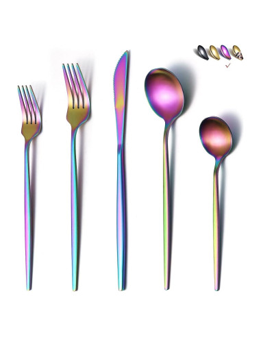 - Platinado Noble Mate Arcoíris de Titanio: El color arcoíris del juego de cubiertos destacará en tu mesa. Son hermosos y geniales, recibirás muchos "me gusta", "elogios", "alabanzas" de tus invitados cuando cenen juntos, de tus seguidores cuando compartas un video de tu cena. Este es el único cubierto que vale la pena tener.