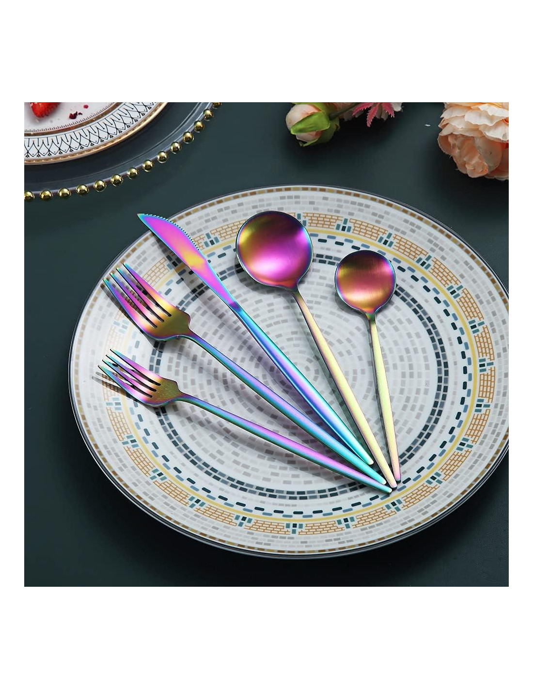- Juego de Cubiertos Mate Arcoíris de 20 Piezas: Incluye Cuchillos de Cena x 4, Tenedores de Cena x 4, Cucharas de Cena x 4, Cucharitas x 4, Tenedores de Ensalada x 4.
