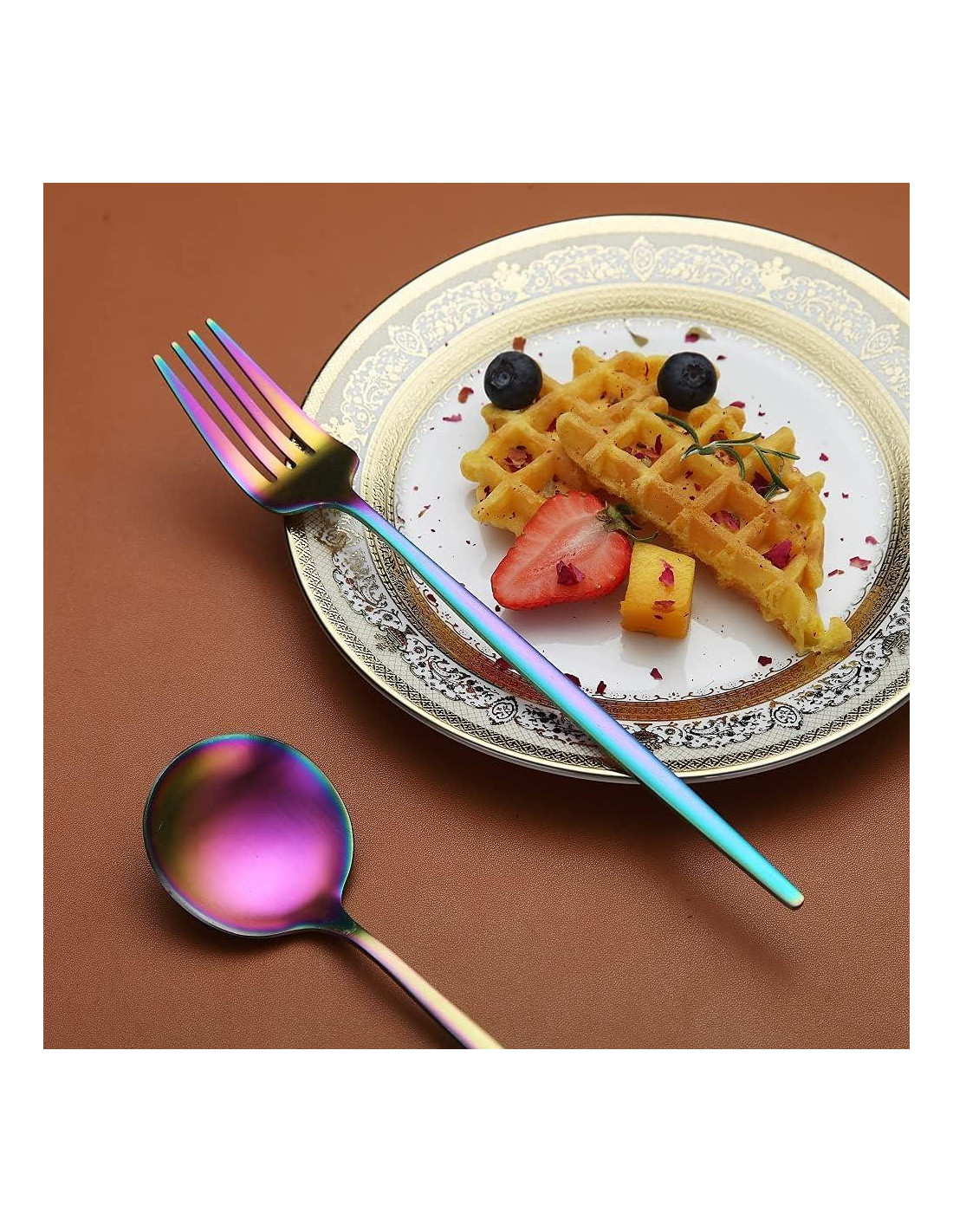 Enfócate en crear un gran diseño para gadgets de cocina; Hacemos lo mejor para mejorar la vida en la cocina a través de la introducción constante de un buen diseño y una inspección de alta calidad. Nuestros productos hablan el lenguaje de la moda y la utilidad, cumplen con los requisitos y expectativas de cada cliente. Hecho de acero inoxidable de alta calidad, los bordes son suaves y elegantes, pulido mate. Libre de plomo, libre de cadmio, libre de ftalatos, libre de BPA, asegurando que los utensilios sean saludables y seguros para el uso diario. Regalo ideal perfecto para bodas, Día de San Valentín, eventos de catering, fiestas, reuniones familiares, catering de lujo, restaurantes temáticos o cenas en casa, regalo perfecto para bodas, inauguraciones de casa, cumpleaños, Día de la Madre, o cenas en casa, y mucho más. También es un regalo perfecto para tu nueva casa. El set incluye: Cuchillos de Cena x 4, Tenedores de Cena x 4, Cucharas de Cena x 4, Cucharitas x 4, Tenedores de Ensalada x 4. Cuchillos de Cena x 4. Tenedores de Cena x 4. Cucharas de Cena x 4. Cucharitas x 4. Tenedores de Ensalada x 4. Cuchillos de Cena: 22.6 cm x 1.6 cm. Tenedor de Cena: 21.5 cm x 2.7 cm. Cuchara de Cena: 20.6 cm x 4.7 cm. Cucharita: 16 cm x 3.8 cm. Tenedor de Ensalada: 18.7 cm x 2.2 cm. El color arcoíris del juego de cubiertos destacará en tu mesa. Son hermosos y geniales, recibirás muchos "me gusta", "elogios", "alabanzas" de tus invitados cuando cenen juntos, de tus seguidores cuando compartas un video de tu cena.