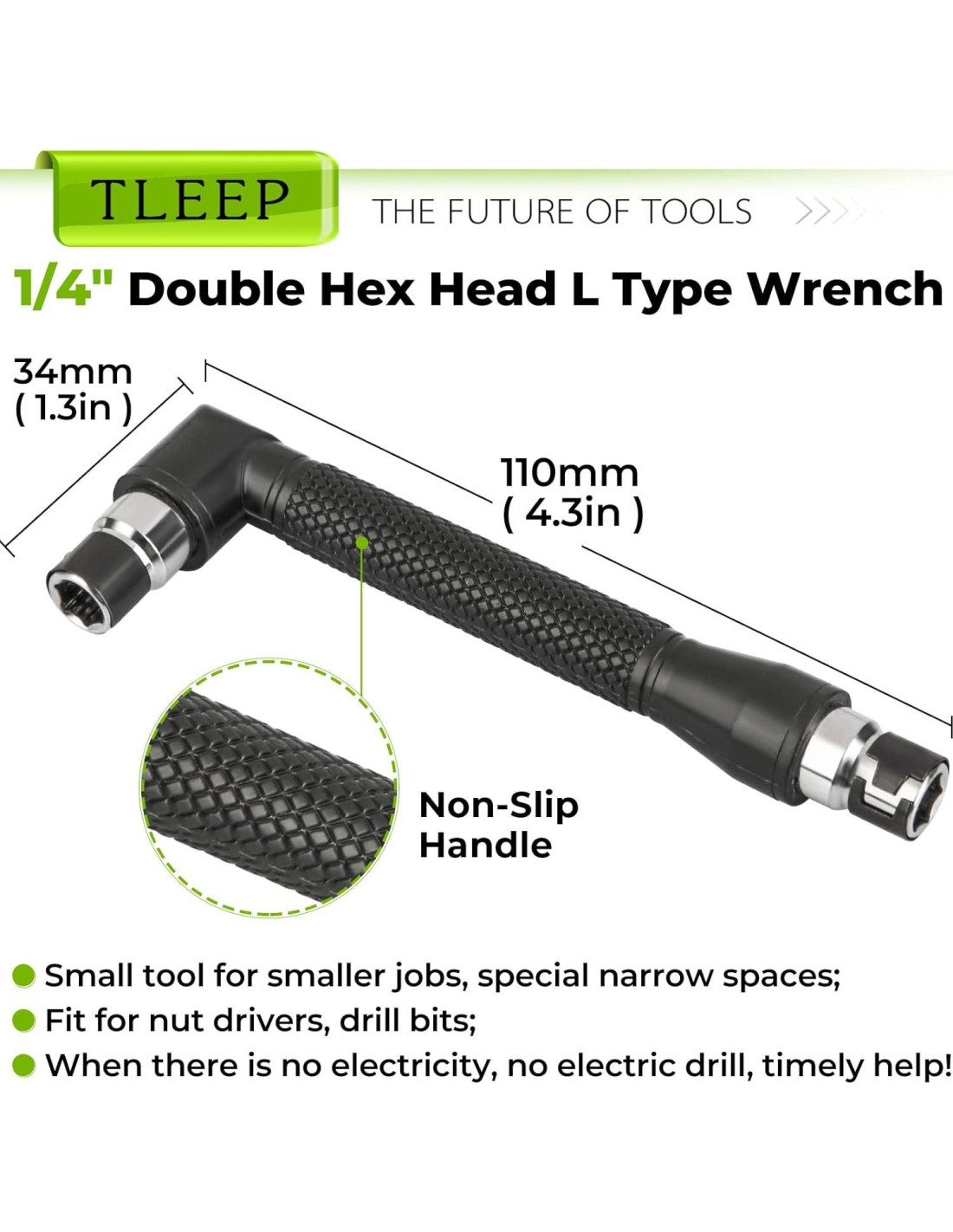 - Llave en L de Doble Hexágono de 1/4", Herramienta Pequeña para Trabajos Más Pequeños, Espacios Especiales y Estrechos: Compatible con destornilladores de tuercas, brocas. ¡Cuando no hay electricidad, sin taladro eléctrico, ayuda oportuna! POR FAVOR: 1. Presta atención a la abrazadera de resorte y al rodamiento de bolas y no los pierdas. Sin ellos, la llave no puede usarse normalmente. Para evitar esto, algunos clientes: colocan un trozo de tubo termorretráctil en cada extremo. 2. No es una llave de trinquete, solo una llave de mango en ángulo recto normal.
