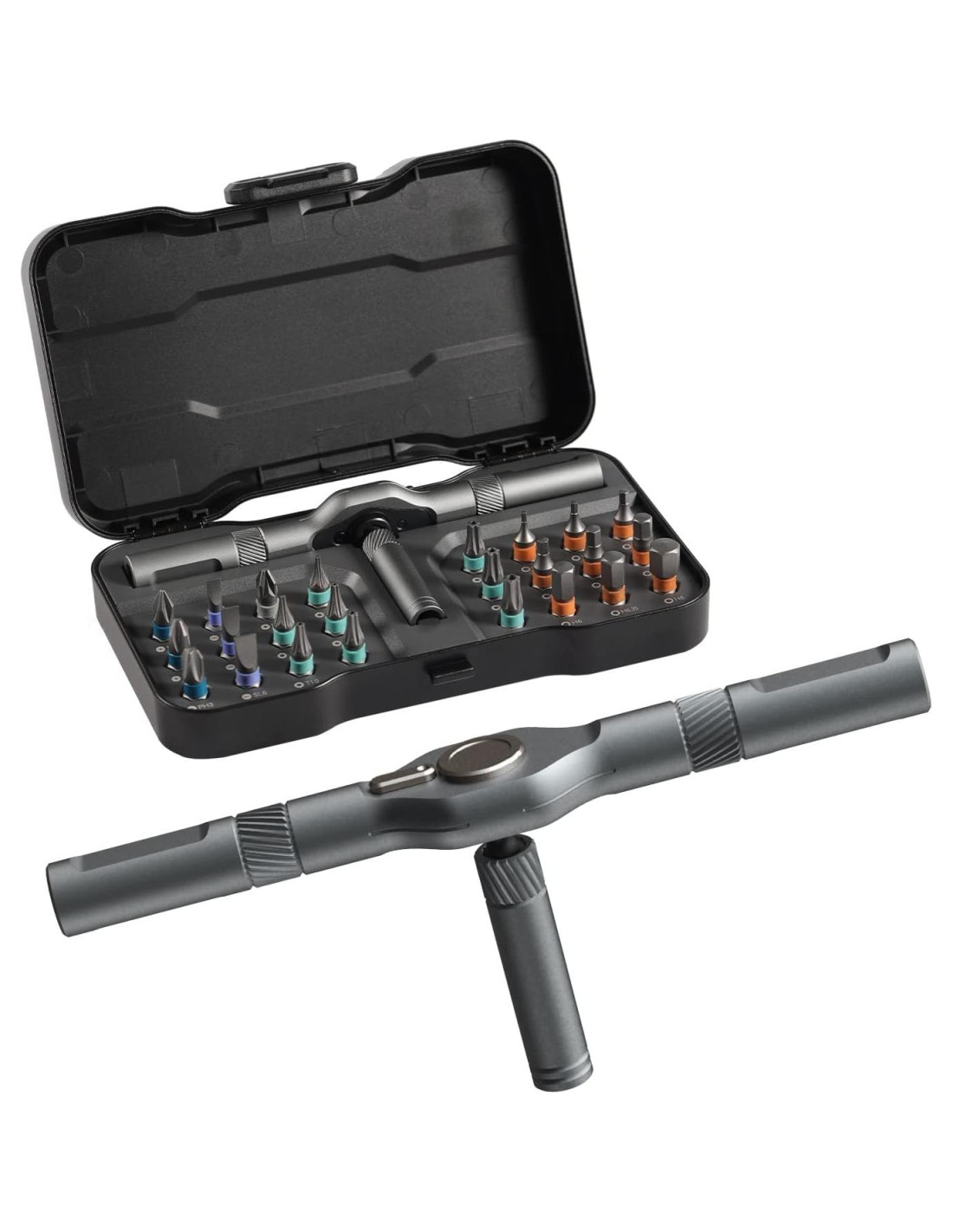- Tamaño de cabeza: PH1, PH2, PH3, SL4, SL5, SL6, T5, T6, T8, T10, T15, T20, T25, T27, H1.5, H2, H2.5, H3, H4, H5, H6, H6.35, H8