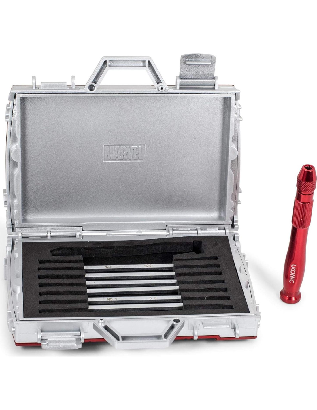 - Coleccionable Oficial de Marvel: Especialmente diseñado pensando en los fanáticos de Marvel, este Juego de Destornilladores en Maletín Réplica de Iron Man, con licencia oficial, es perfecto para cualquiera que busque completar pequeñas reparaciones. Este juego de herramientas es un imprescindible para cualquier héroe de corazón.
