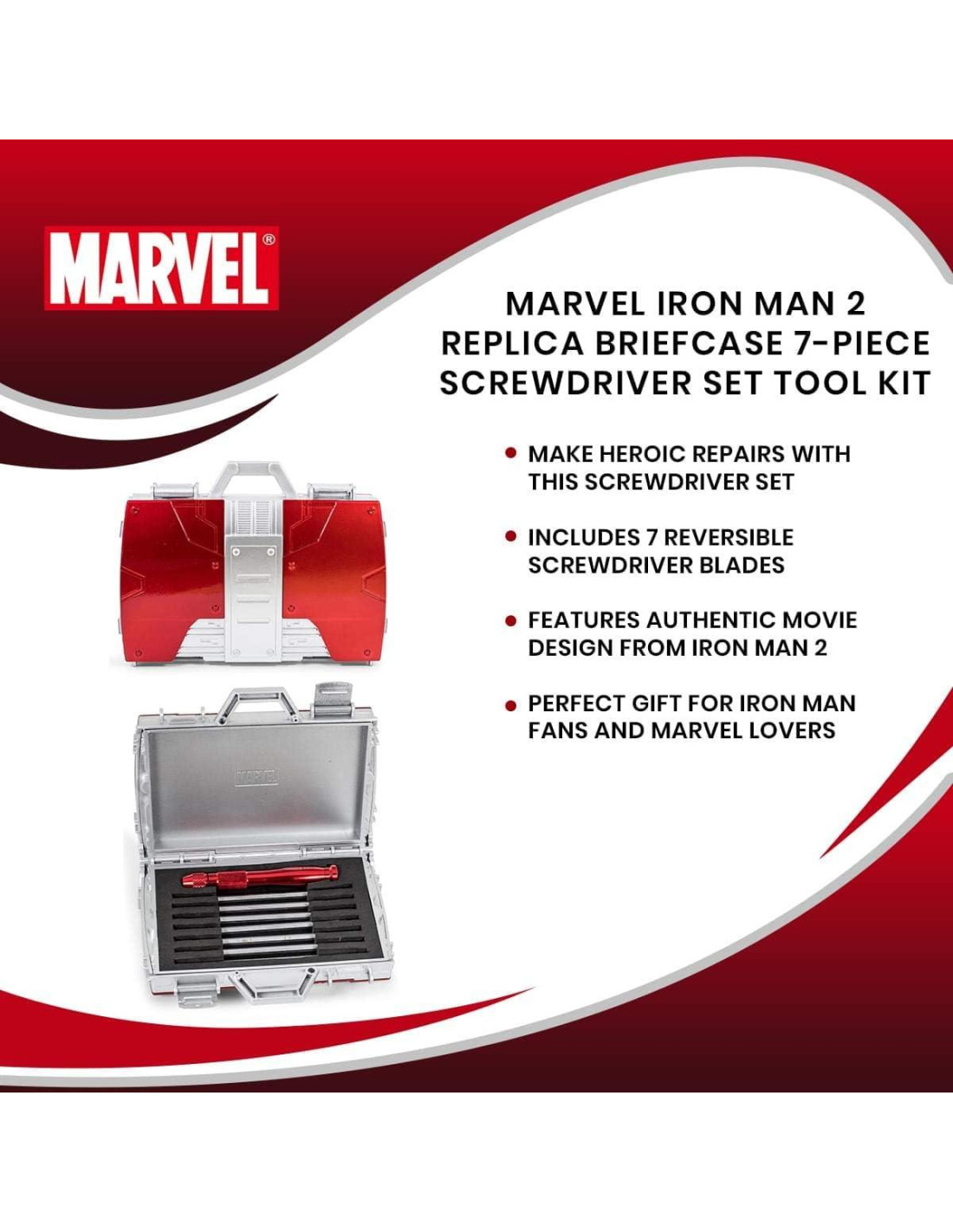 - Repara como Tony Stark: Todas tus reparaciones lucen más heroicas cuando estás equipado con el Juego de Destornilladores en Maletín Réplica de Iron Man. Canaliza tu Tony Stark interior y completa una variedad de tareas con este práctico juego de herramientas.