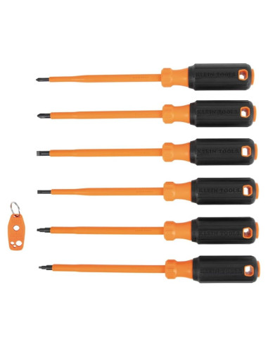 Este Juego de Destornilladores Aislados de 7 Piezas, Hecho en EE. UU., incluye destornilladores Phillips variados (Nros. Cat. 6856INS, 6836INS), ranurados (Nros. Cat. 6816INS, 6826INS) y cuadrados (Nros. Cat. 6886INS, 6846INS), además de un magnetizador (Nro. Cat. MAG2). Cada destornillador es probado individualmente para superar los estándares IEC 60900 y ASTM F1505 para herramientas aisladas. Dos capas de aislamiento proporcionan protección contra descargas eléctricas. Durante más de 160 años, Klein Tools ha fabricado herramientas manuales de calidad premium y grado profesional que ofrecen el rendimiento, durabilidad y precisión necesarios para hacer el trabajo correctamente. Nuestra familia de ingenieros, trabajadores y artesanos continúa aportando seis generaciones de experiencia en cada herramienta que creamos utilizando solo los materiales de la más alta calidad, mano de obra superior y manteniendo la fabricación lo más cerca de casa posible. Klein no es solo el nombre de nuestra empresa, también es el nombre de nuestra familia. Y dado que somos una empresa estadounidense de propiedad familiar y gestionada por la familia, sabes que puedes contar con nosotros para estar aquí mañana. Klein Tools no solo fabrica grandes productos, fabricamos grandes productos que cumplen con las demandas de los profesionales que los utilizan todos los días ... Desde 1857.