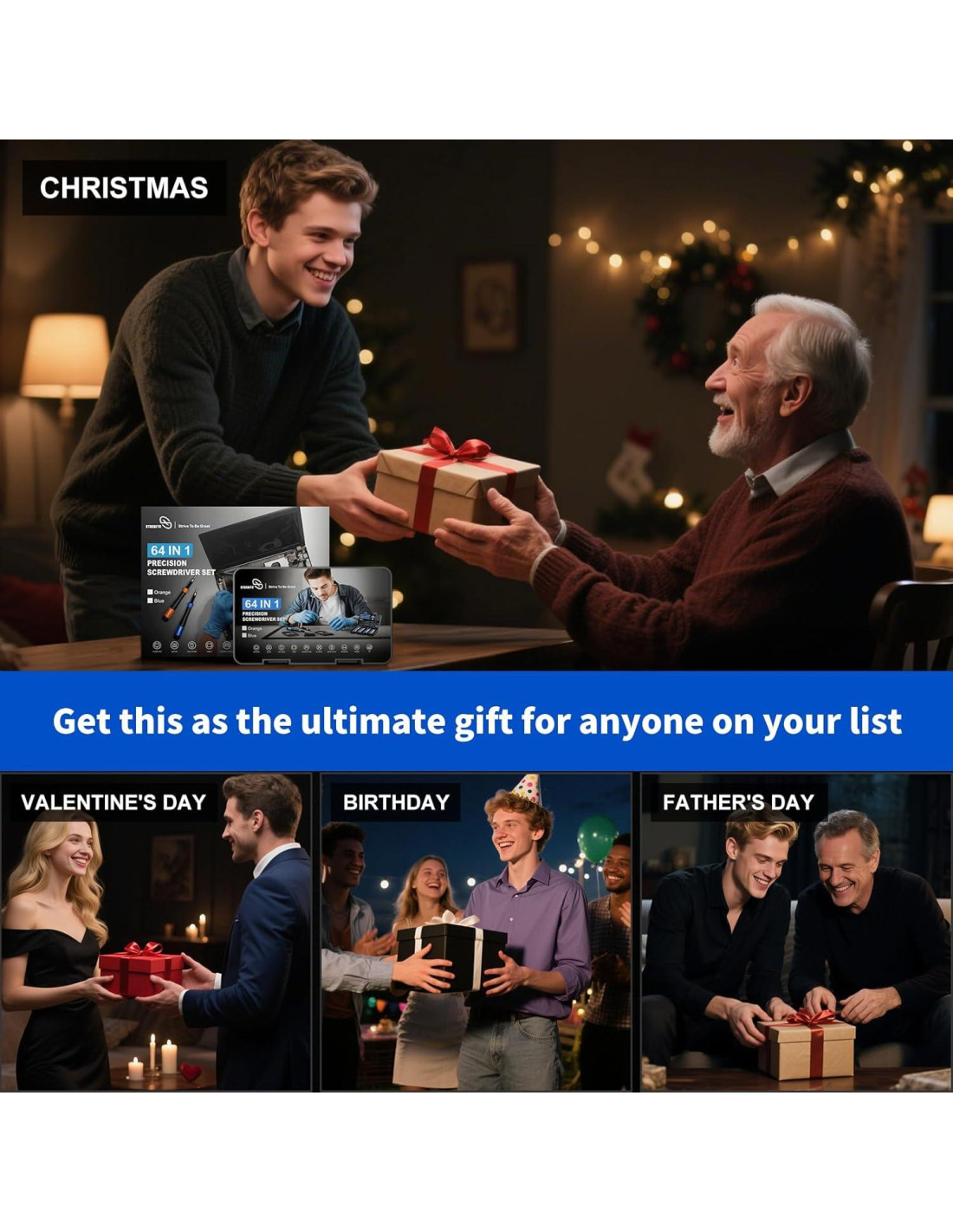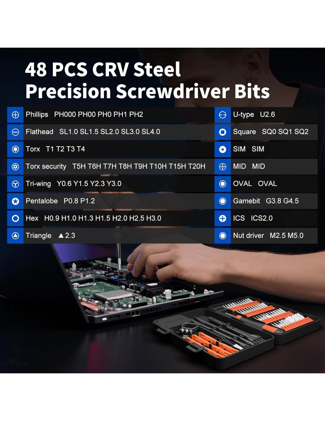 - Juego de Destornilladores de Precisión 64 en 1: Este pequeño juego de destornilladores incluye 48 puntas (Phillips, Plano, Torx, Torx de seguridad, Triwing, Pentalobe, Hexagonal, Triángulo, U, Cuadrado, SIM, MID, OVAL, Gamebit, Destornillador de tuercas). Es un kit completo de reparación de electrónica que ha sido diseñado profesionalmente para reparar computadoras, PC, laptops, Macbooks, tabletas, teléfonos, PS4 PS5, XBOX, Switch, gafas, drones, relojes, timbres Ring y más.