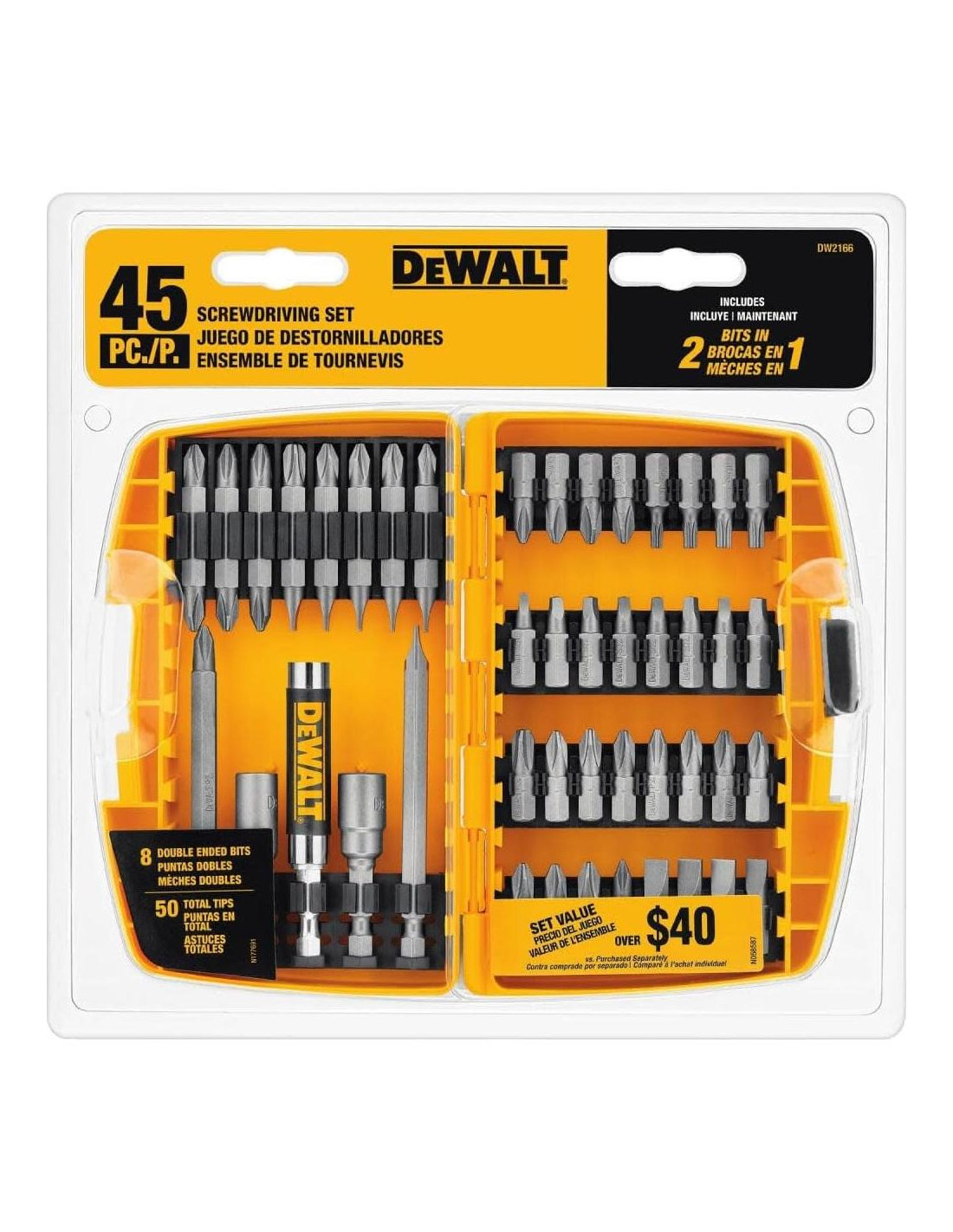 Descripción del Producto Nuestro juego de accesorios de taladro estándar ahora viene en el sistema ToughCase+, la última adición a nuestra línea de almacenamiento de accesorios. El sistema ToughCase+ es un sistema de estuche conectable diseñado para optimizar el espacio de almacenamiento y mantener sus puntas organizadas. El diseño patentado de barra de puntas del juego de destornilladores permite una fácil extracción de las puntas y la tapa transparente le permite ver el interior de un vistazo. Del Fabricante El Juego de Destornilladores de 45 Piezas DEWALT incluye los accesorios de destornillador más comúnmente utilizados. El estuche de resistencia industrial es fuerte y duradero. El juego incluye puntas Phillips, cuadradas, ranuradas y de doble extremo.
