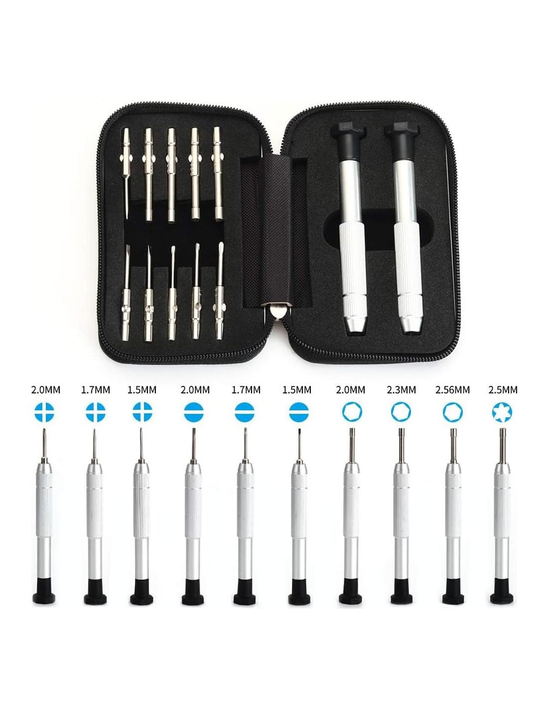 - Destornilladores de 10 estilos: 3 destornilladores de ranura (1.5/1.7/2.0 mm), 3 destornilladores Phillips (1.5/1.7/2.0 mm), 3 destornilladores de tuerca hexagonal (2.0/2.3/2.56 mm), 1 destornillador de tuerca Torx (2.5 mm) están empaquetados en una caja exquisita para diferentes tornillos. Cuando desees cambiar las puntas, empújalas hacia adentro antes de sacarlas