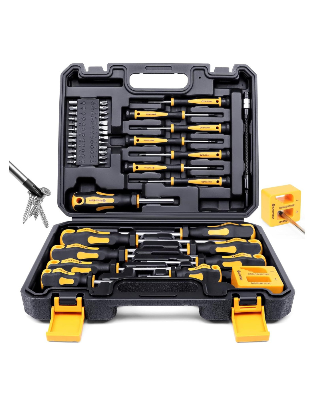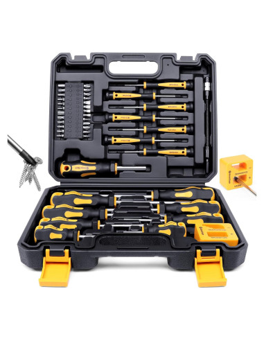 - Juego de destornilladores magnéticos de 43 piezas que consiste en 8 destornilladores convencionales, 6 destornilladores de precisión y 25 puntas de destornillador. Hay 5 tipos diferentes de tornillos que incluyen Phillips, Planos, Torx, Hexagonales y Pozidriv, 1 herramienta magnetizadora y desmagnetizadora.