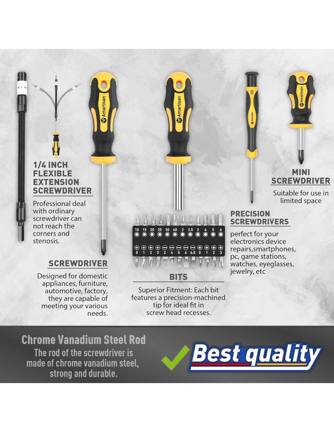 - Materiales premium, barra de destornillador hecha de acero de cromo vanadio 6150, más fuerte y resistente que la mayoría de los aceros al carbono, está tratada con un recubrimiento de cromo para resistir la corrosión y tener una buena apariencia.