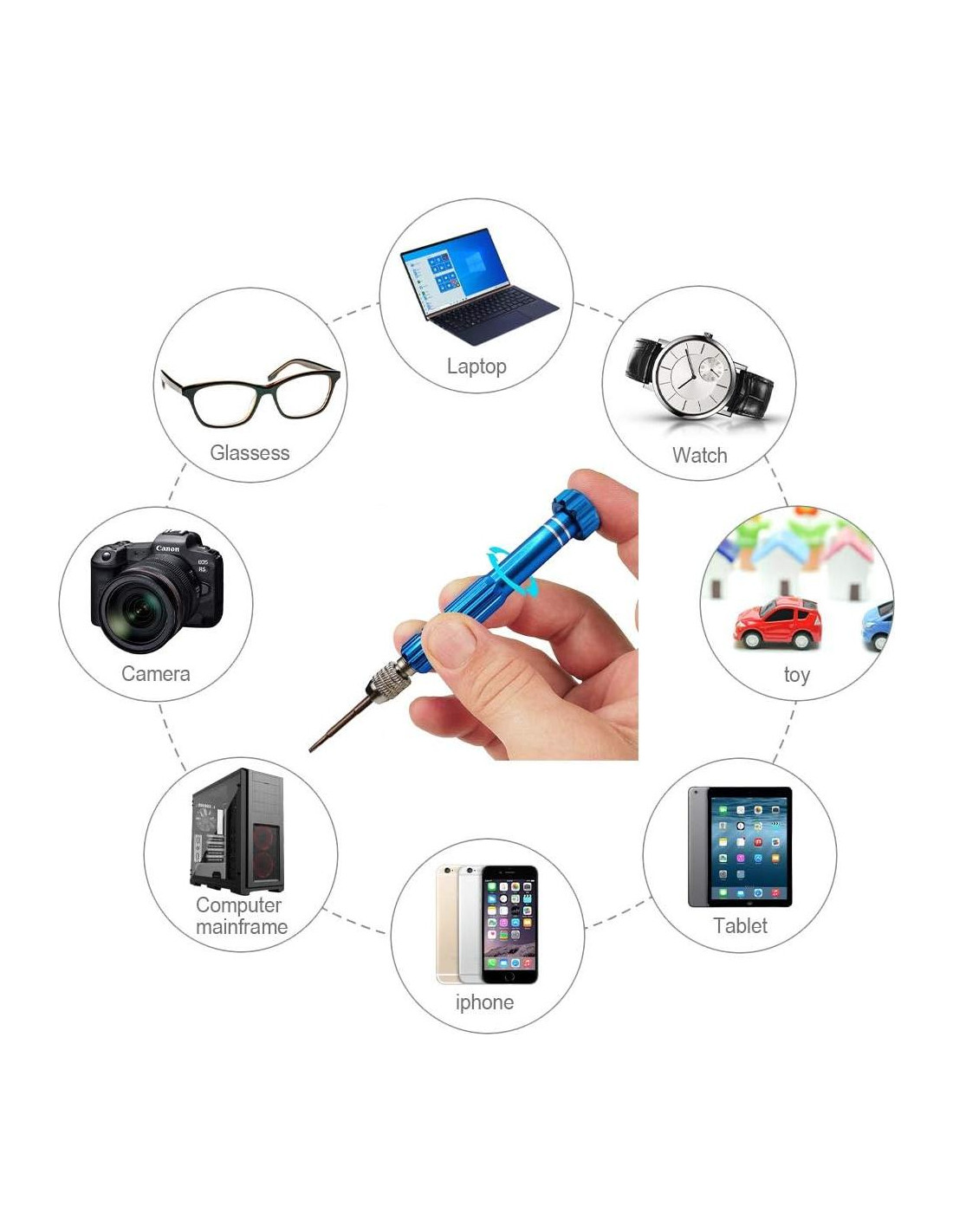 - Multifuncional Incluye varias puntas, adecuado para reparaciones a pequeña escala de la mayoría de gafas, relojes, teléfonos, pequeños electrónicos y juguetes.
